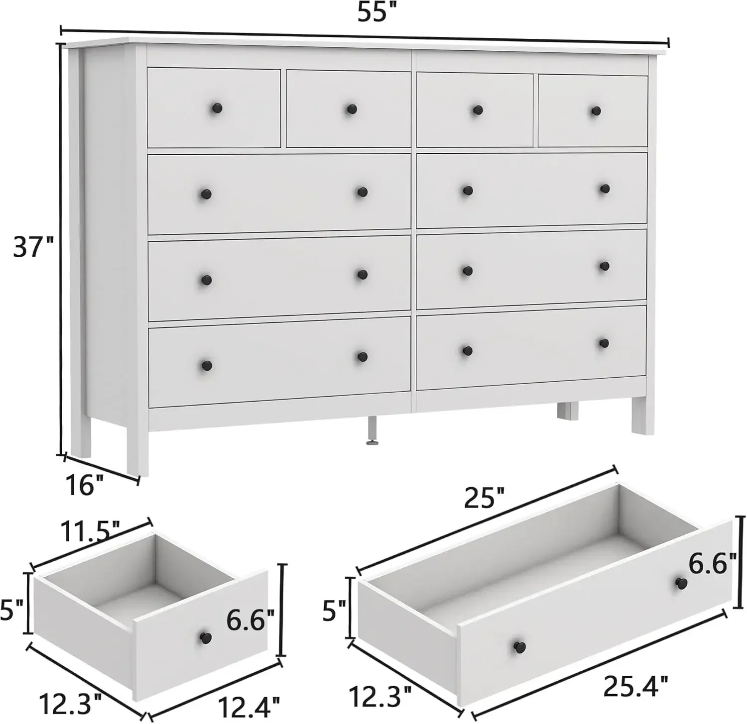 10 Drawer Dresser, 55" Modern White Dressers and Chests of Drawers, 10 Drawer Wide Dressers for Bedroom