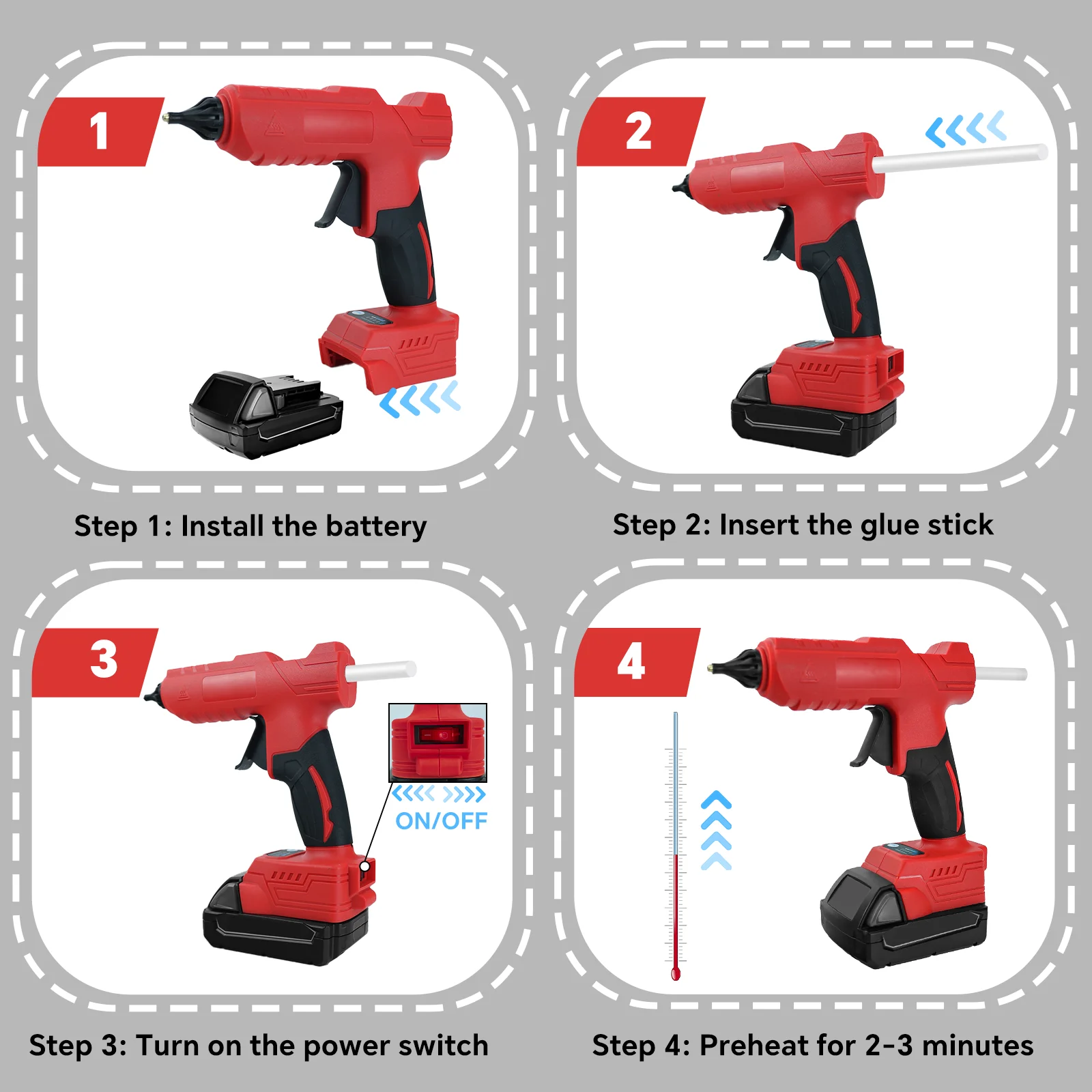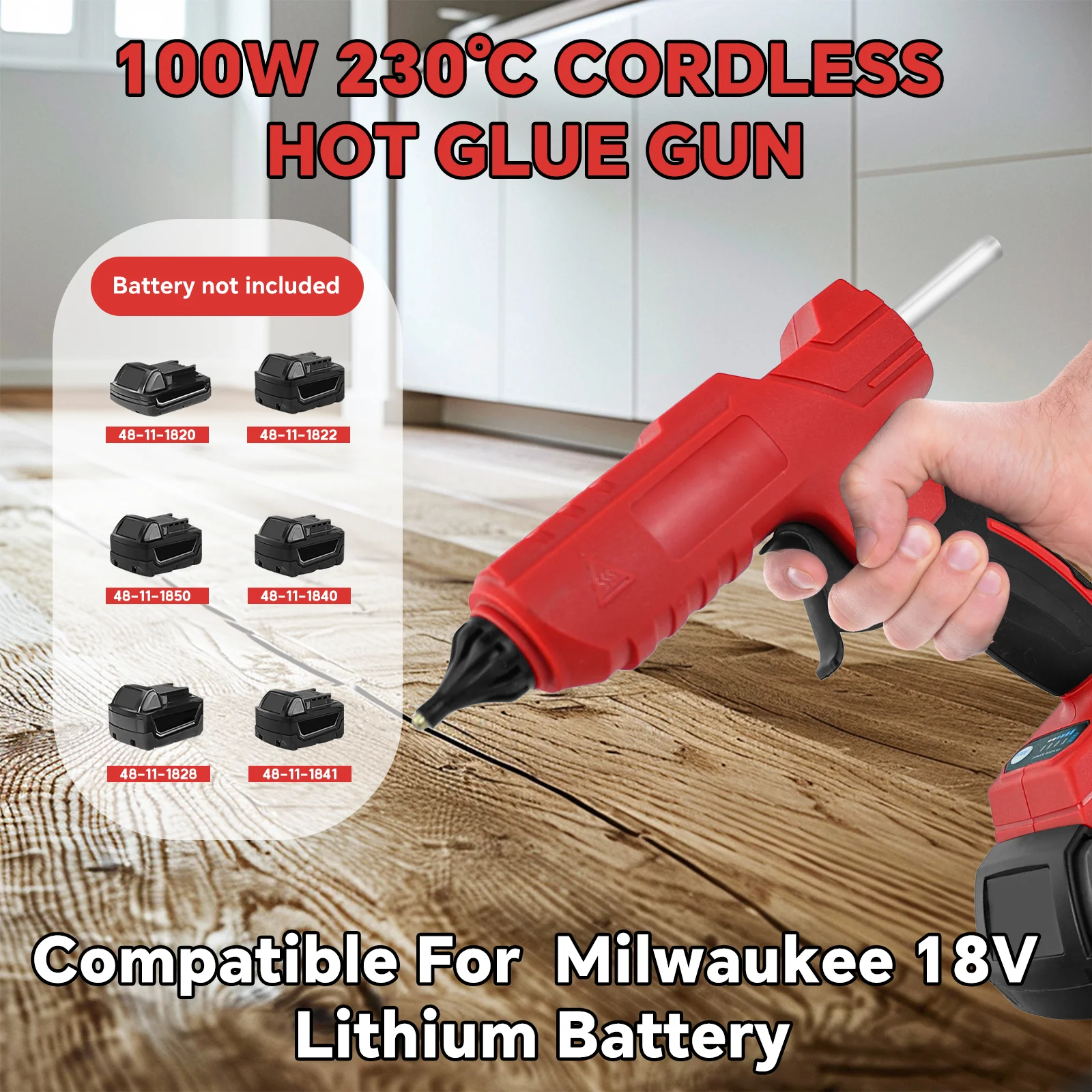 【Battery Powered】---The Cordless hot glue gun for Milwaukee 18v lithium-ion batteries 48-11-1820 48-11-1822 48-11-1840 48-11-1850 48-11-1852 48-11-1860 48-11-1862 and more. Easy to use even when there is no power supply outdoors, as long as you bring batteries. And you no longer need to be tethered to an outlet or struggle with tangled cords, making it easy to work in tight spaces, on job sites, or outdoors. Warm tip: this product does not include batteries.