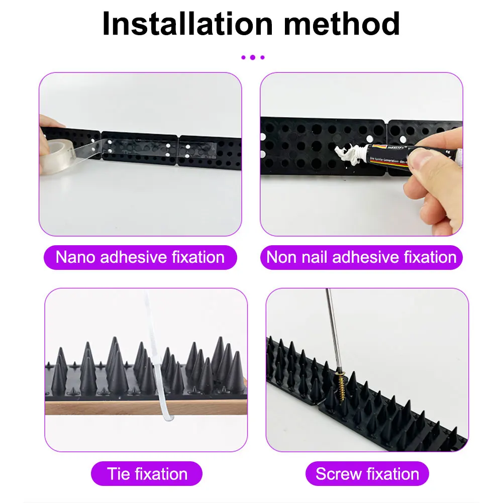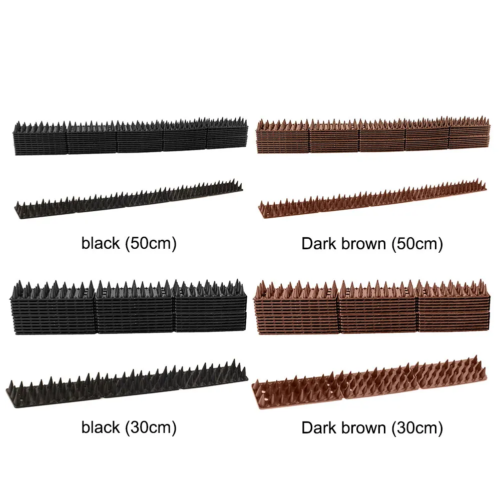 Feature: 1.Prevent Birds from Perching: Designed to deter birds from effectively standing on bird deterrent spikes, safeguarding your space from unwanted avian visitors. 2.Easy Installation in Tight Spaces: These pigeon outdoor spikes are designed for easy installation, ideal for narrow areas like eaves and ledges where birds often perch. 3.Rust-Free Material: Made from high-quality plastic, these anti bird defender spikes resist rust and can be utilized over a long period without wear. 4.Secure Installation Methods: Use nails/screws, double-sided tape, or strong cable ties to fasten spike defender fence wall spikes to any flat surface. 5.Safe Warning for Animals and Humans: Provides a clear warning to animals and humans to stay away without actually harming them. Specification: Origin: Mainland China Material: PP Size: 30cm/50cm Note: ![]()