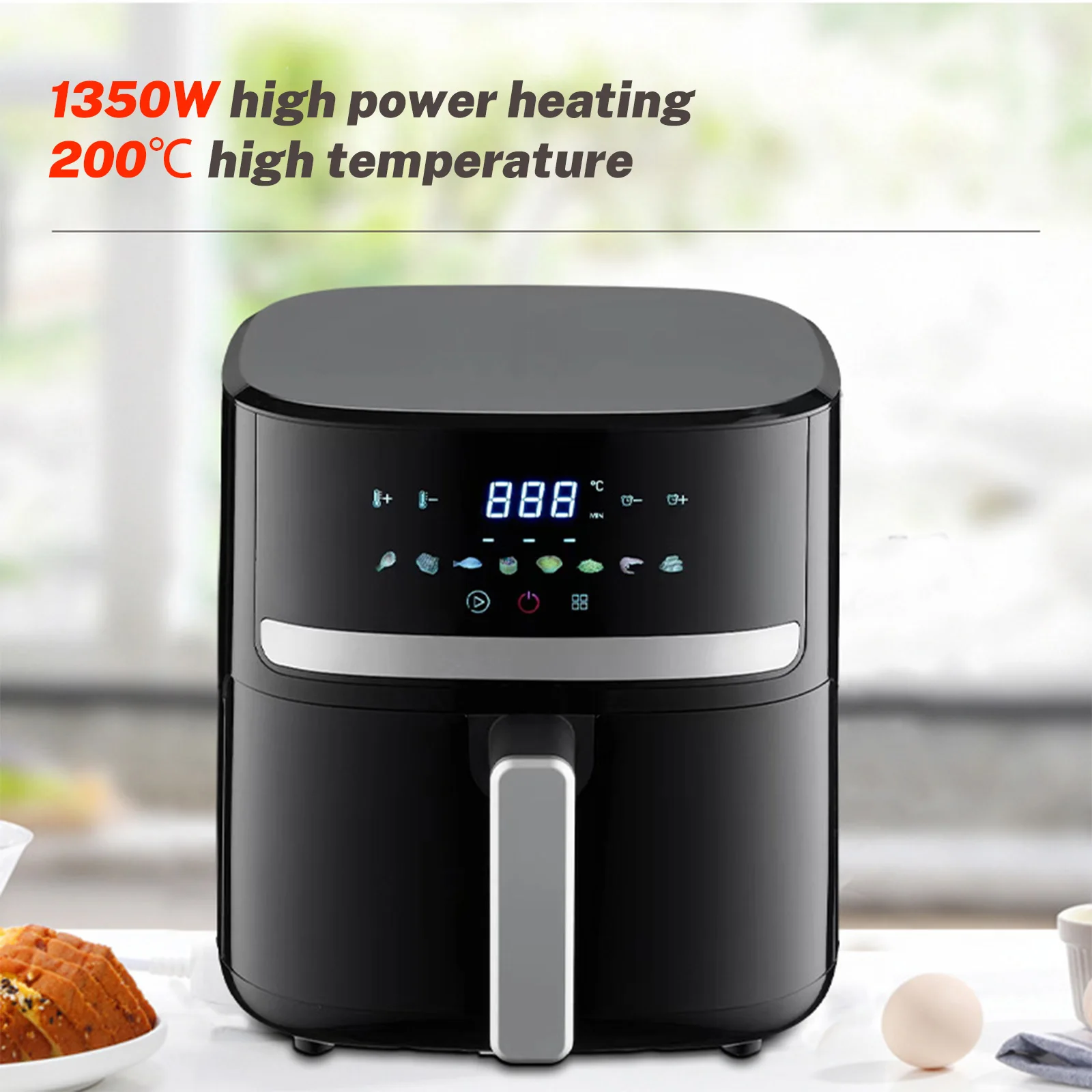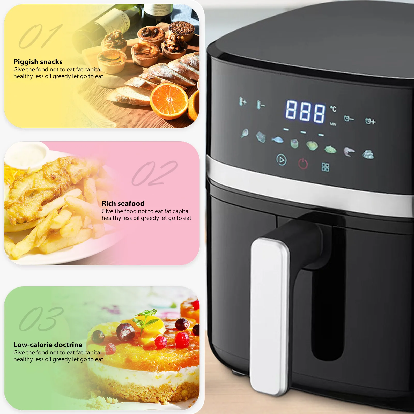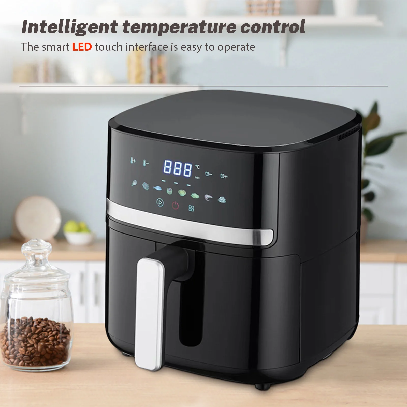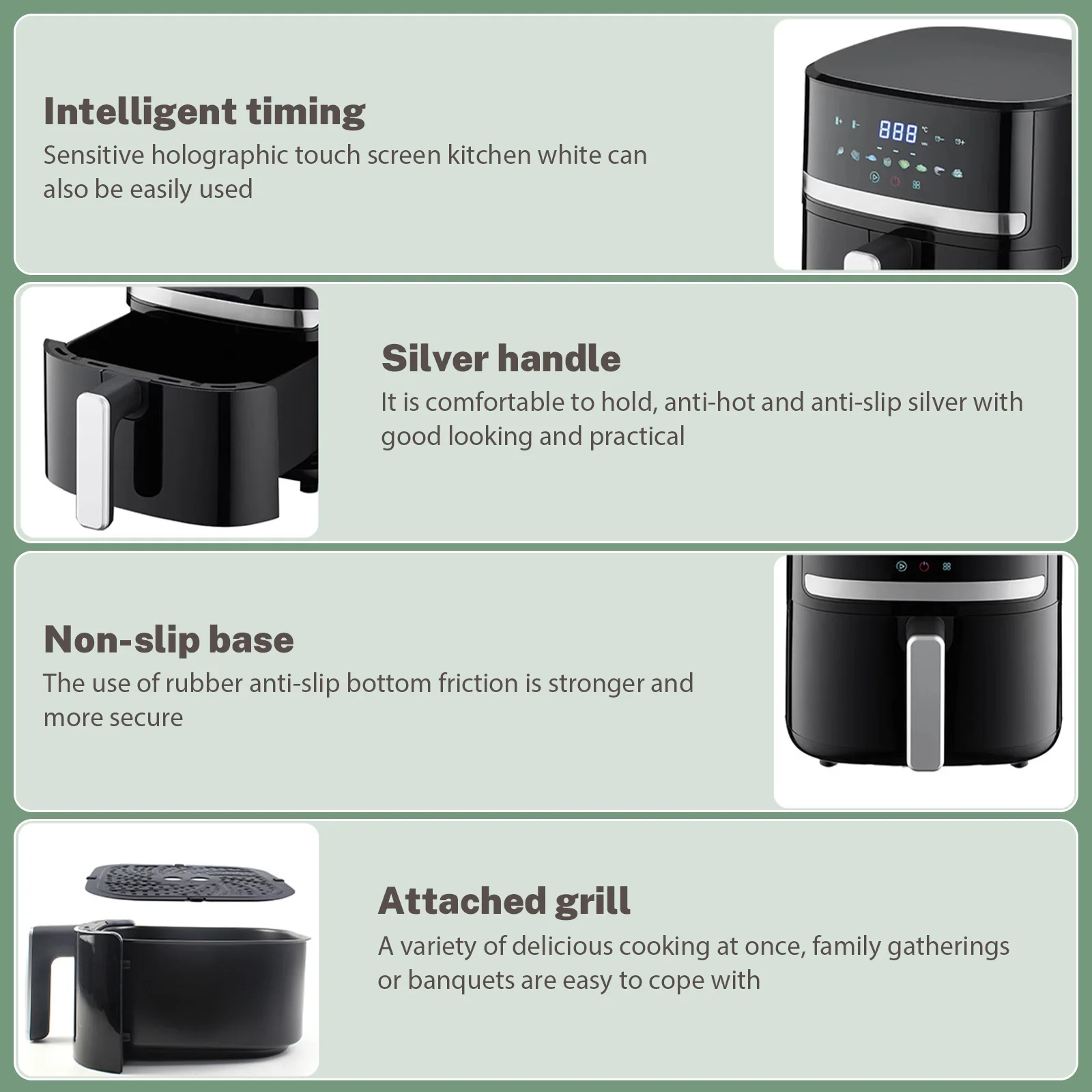 1. LED touch screen and safety materials: The Air Fryer is equipped with an LED touch screen and transparent window, made of food. food grade materials, 100% BPA free, and odorless.