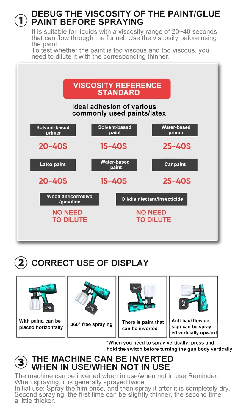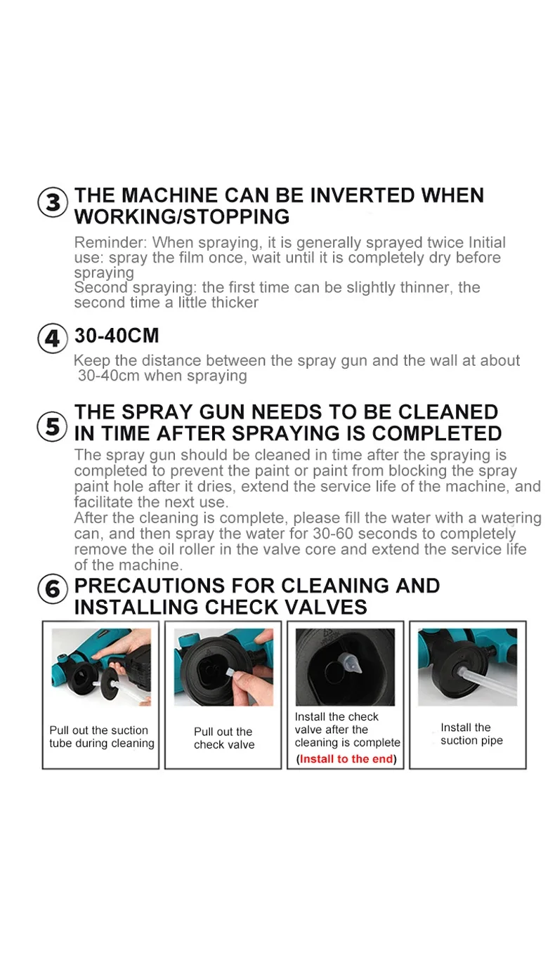 【Easy to Use & Clean】With the lightweight body, you can easy to take apart, reassemble and get back at it. When you have completed your painting job, you will need to remove the motor parts and battery, then soak other parts in water to clean. Important tips, after each use, please clean the nozzle with the needle immediately to prevent clogging the liquid outlet.