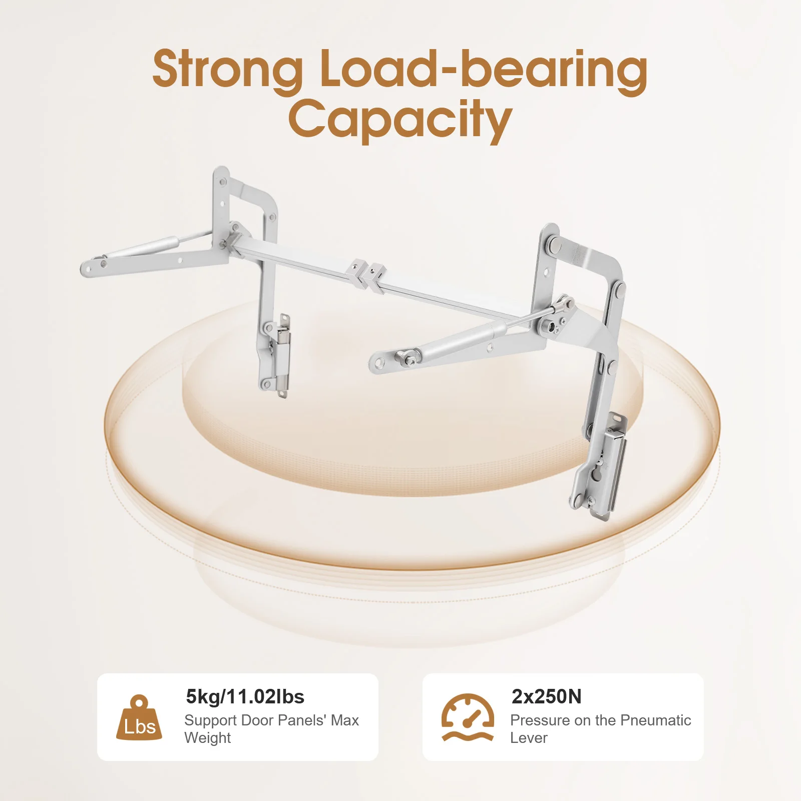 Strong Load-bearing Capacity: The product can support the weight of door panels up to 11.02lbs and the pressure of the pneumatic support bar is 2x250N, so you can rest assured that most cabinet doors(not included) are suitable.