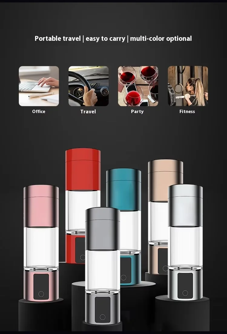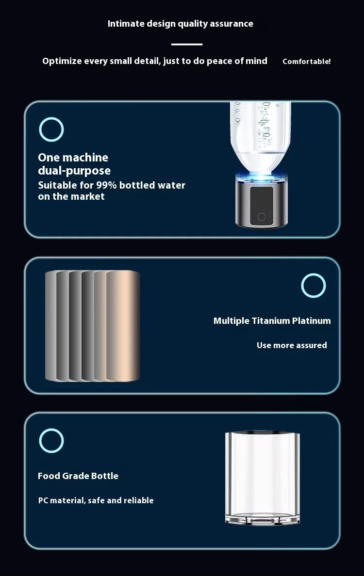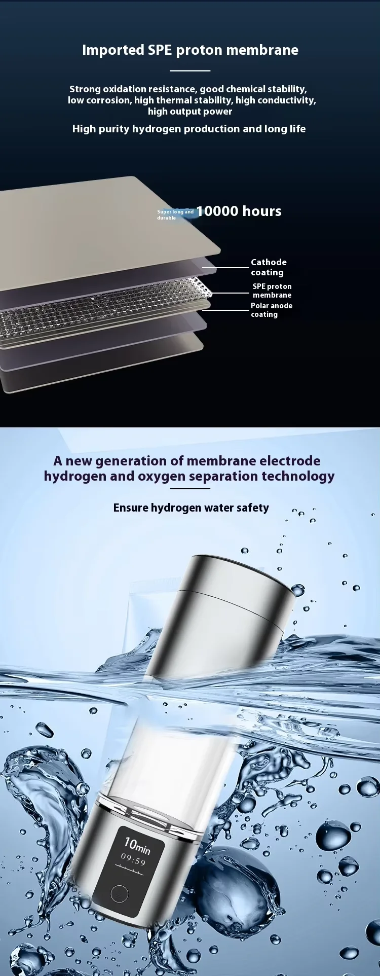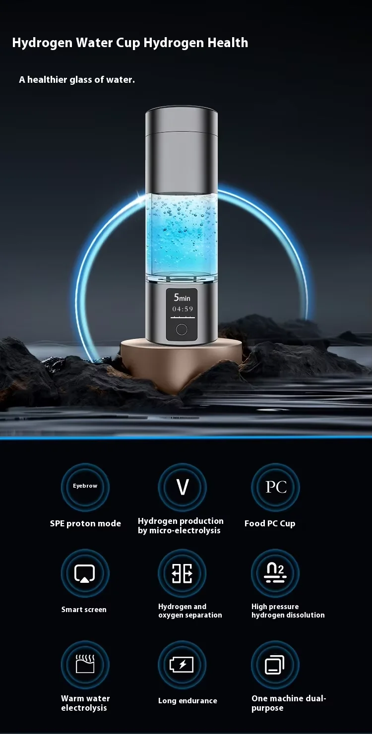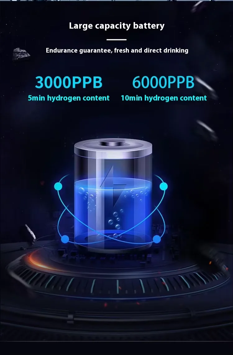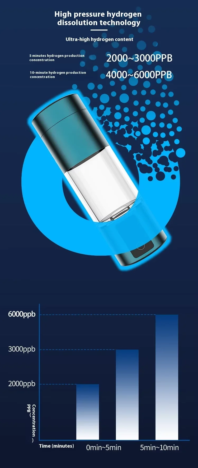 The principle of a hydrogen water bottle is to generate hydrogen gas by electrolyzing water, and then dissolve the hydrogen gas in water to form hydrogen rich water. Specifically, there is an electrolysis module inside the hydrogen water bottle that electrolyzes water molecules to produce hydrogen and oxygen by energizing the electrodes. Hydrogen gas subsequently dissolves in water, forming hydrogen rich water.
