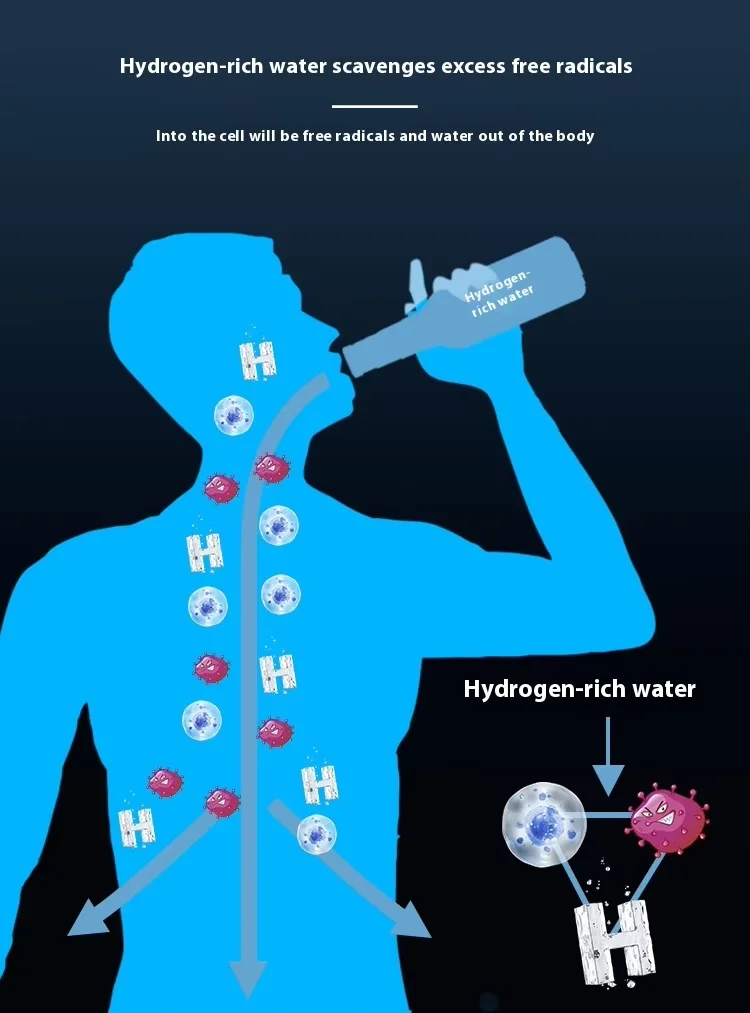 1. Antioxidant: Hydrogen water has strong antioxidant capacity and can eliminate harmful free radicals in the body. Free radicals are important factors leading to cell damage, aging, and various diseases. Hydrogen water helps protect cells from damage by neutralizing these free radicals. Hydrogen water can reduce cell and tissue damage caused by oxidative stress, thereby helping to prevent the occurrence of various chronic diseases.