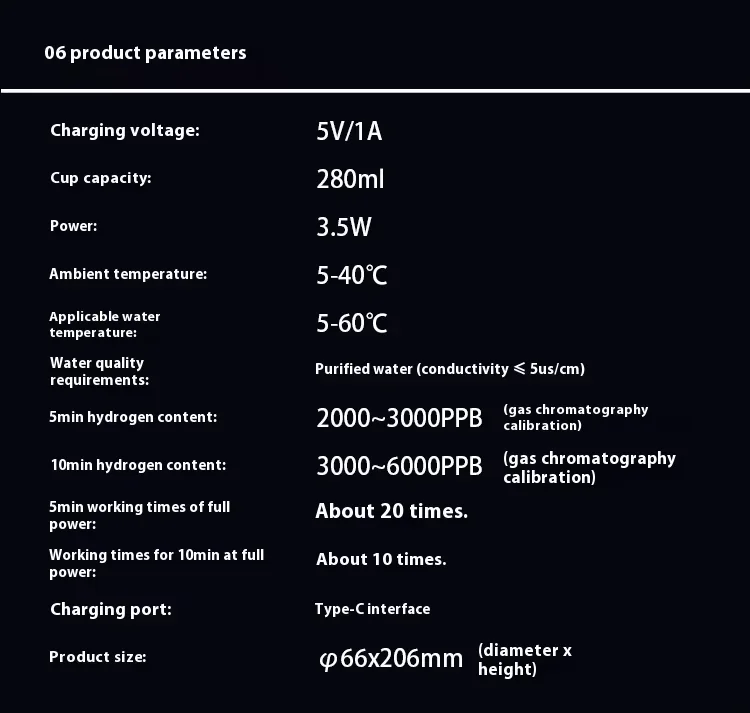Electrolysis process: In a hydrogen water bottle, water molecules are decomposed into hydrogen gas and oxygen gas through the electrolysis process. After the electrodes in the electrolysis module are energized, hydrogen ions and oxygen ions in water molecules are separated to form hydrogen gas and oxygen gas.