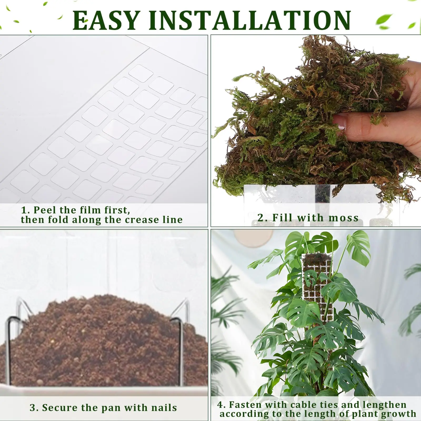 [Easy to install and solid design]: Our plastic moss rods are very convenient and can be easily installed. The moss pole of the plant has two fold lines, which are folded along the folding line to form a semicircular (D -shaped) moss. Do not roll it directly into cylindrical! Fill it with moss, insert it into the ground around the plant stems, fix the stems with garden tie, and then insert the ground wooden stake.