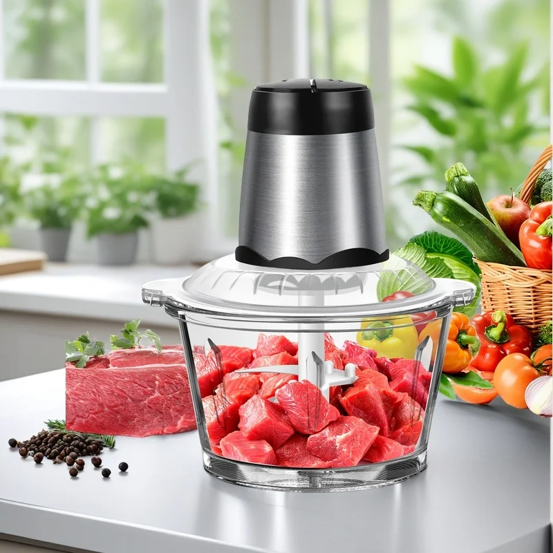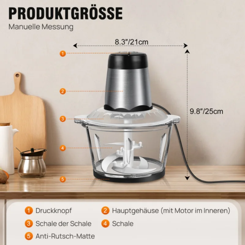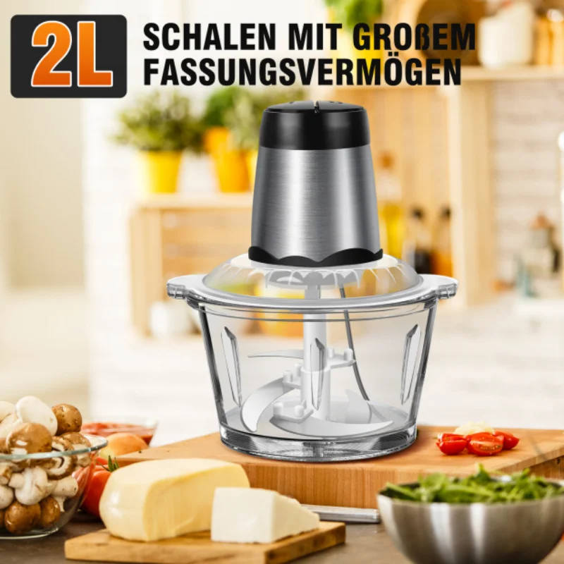 300W Elektrischer Zerkleinerer - 2L Glasschüssel, 2 Geschwindigkeitsstufen, 4 Klingen für Fleisch/Gemüse