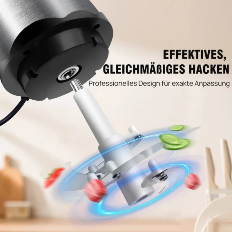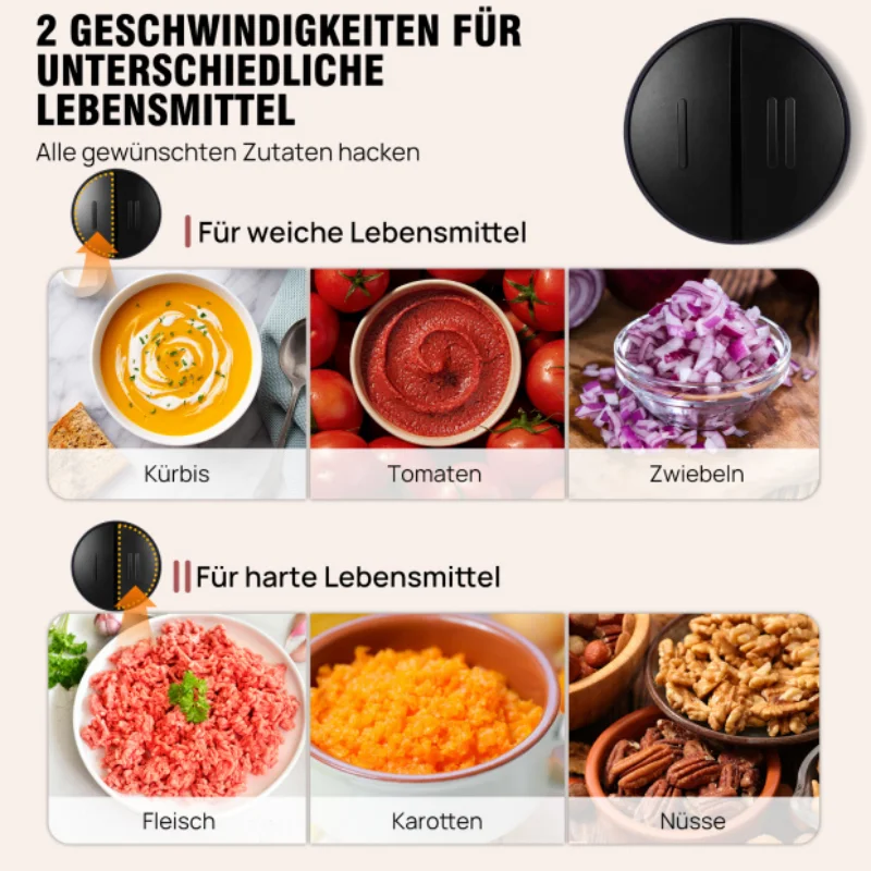 - 2 einstellbare Geschwindigkeiten - Puls für grobe Schnitte / Kontinuierlich für feines Zerkleinern