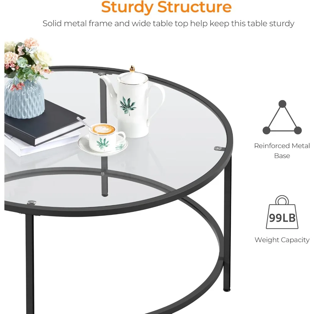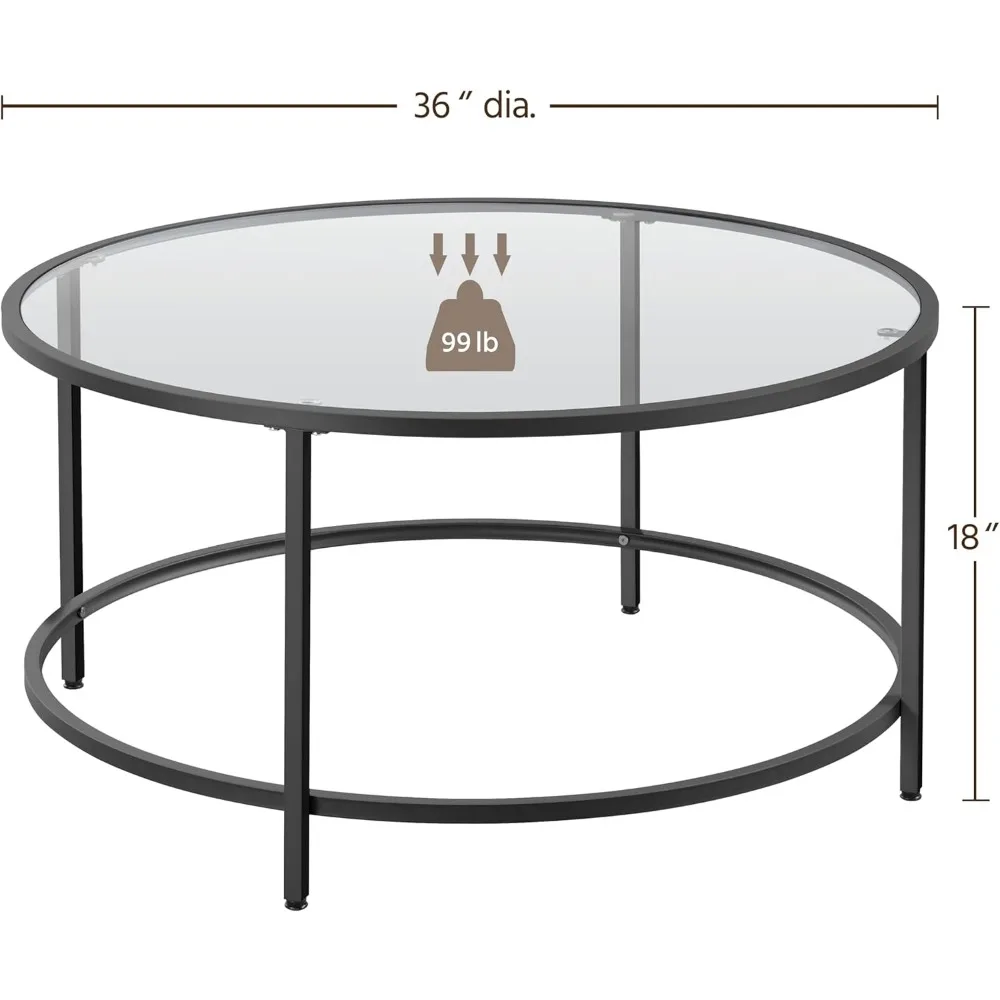36" Round Glass Coffee Table, Black Circle Coffee Table Center Table with Glass Top, Small Coffee Table