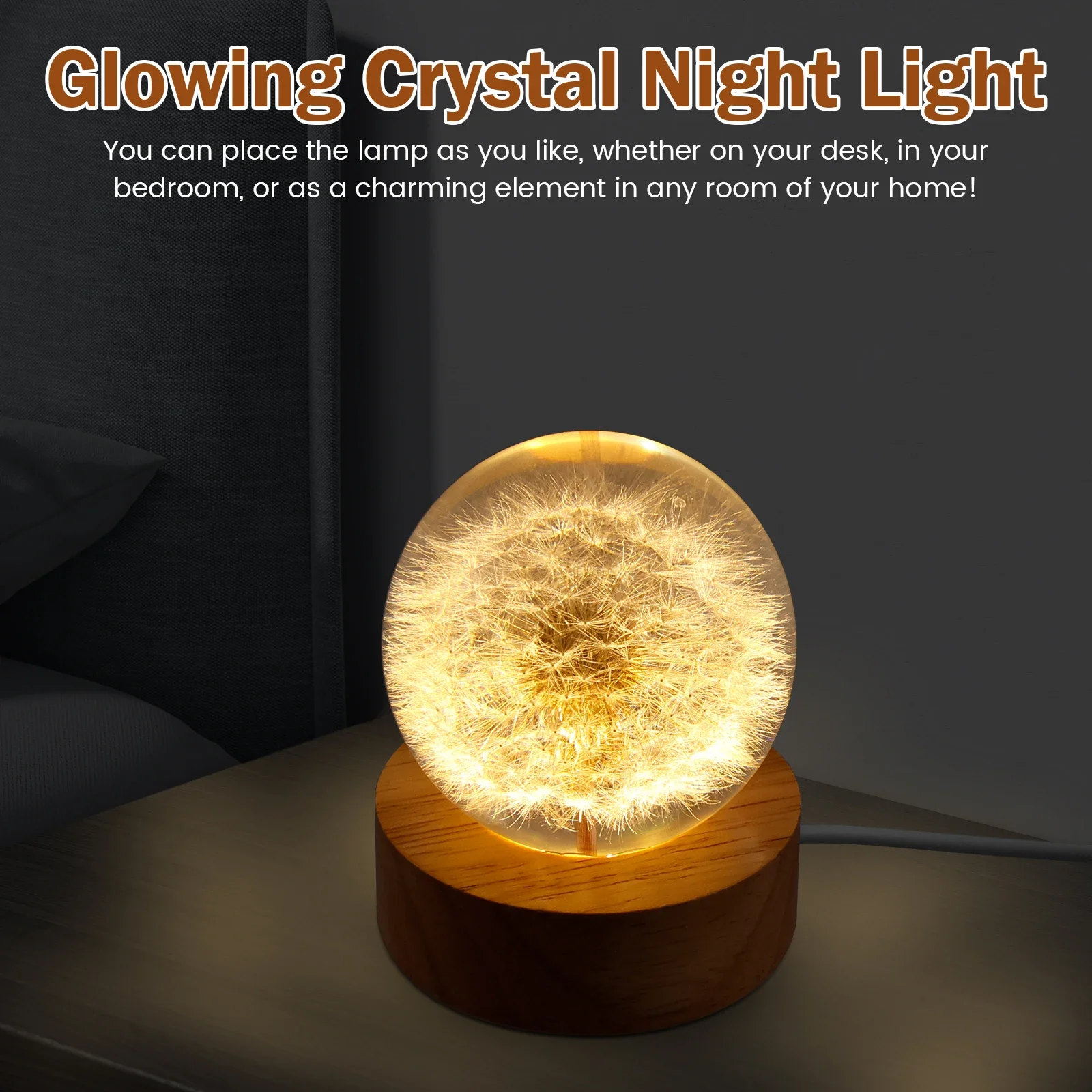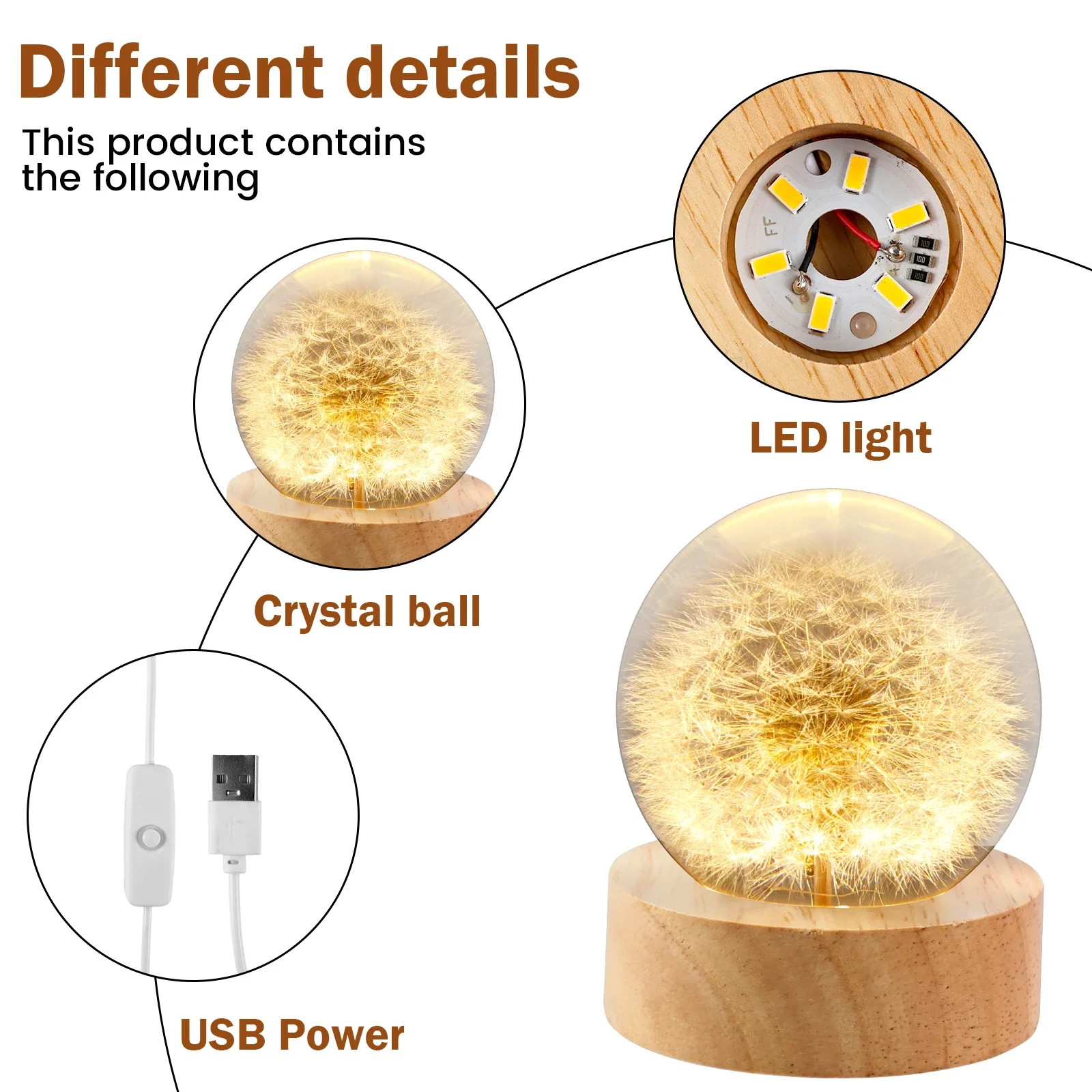 [USB Powered] The base of this dandelion crystal ball light comes with a USB cable, which makes it easy to light up the night light by simply powering it on, perfect for placing on a desk, next to the bed or anywhere in the room. It is a practical and charming night light decoration.