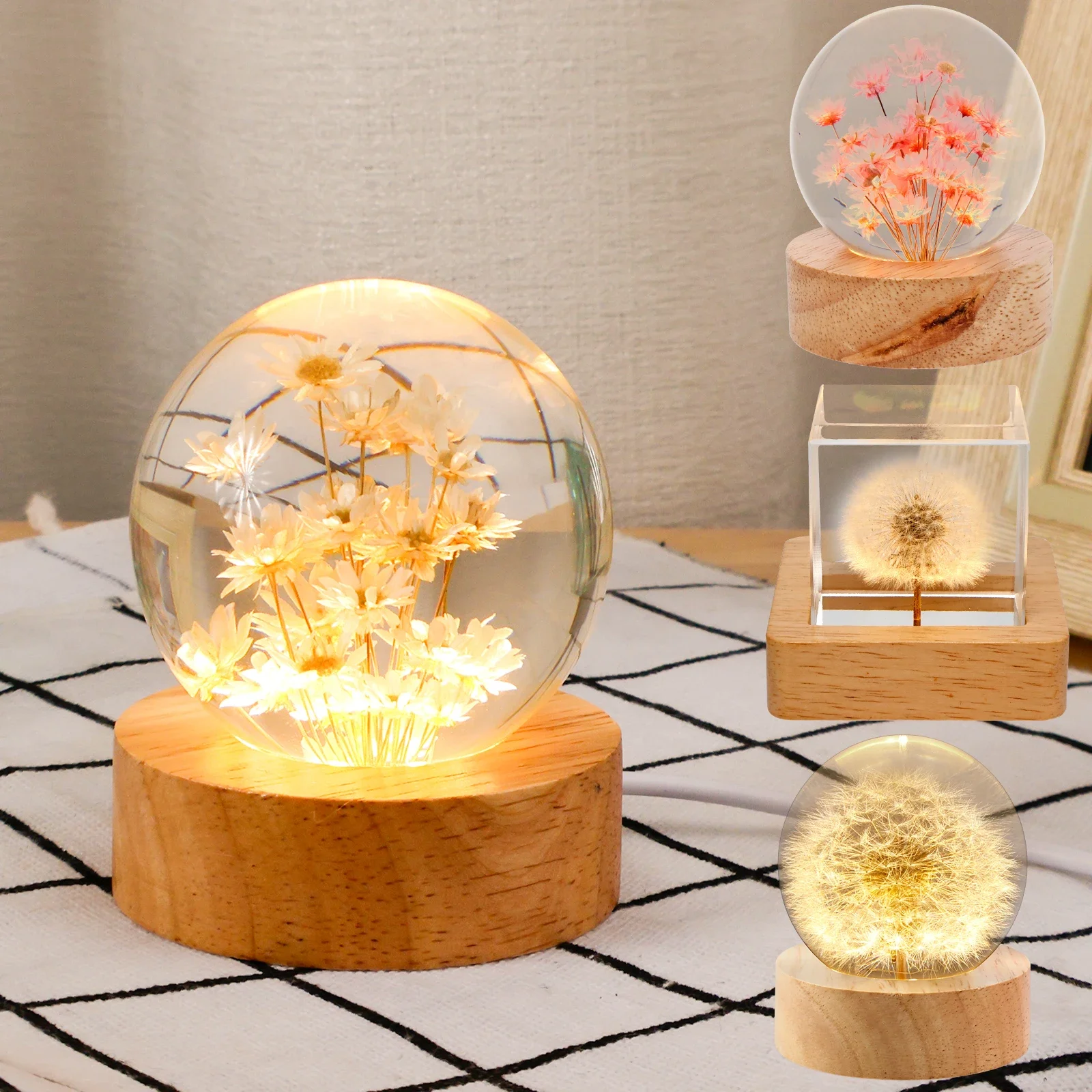 3D Dandelion Crystal Ball LED Night Light with Beech Wood Stand Preserved Flower Sphere Ball Resin Craft Home Decor Bithday Gift