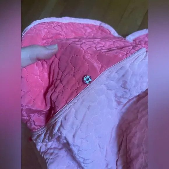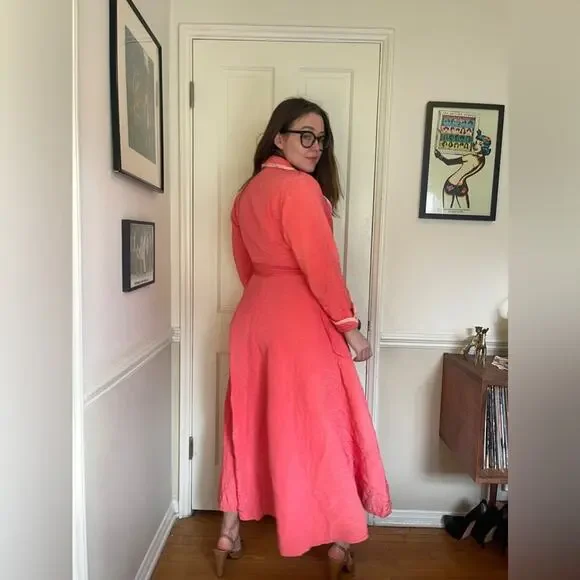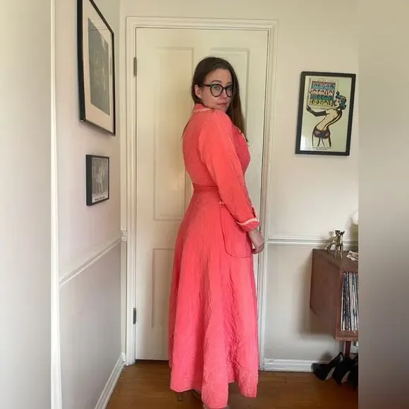 This is a gorgeous 1940s vintage robe. Made of a salmon colored pink quilted fabric with light pink piping. The robe has an oversized collar, one front pocket and matching belt.It has a fit and flare style with a fitted top and flared bottom. Overall in good vintage condition - has a few minor pulls and one small spot in the front - see pics.Seams have been repaired.Has snap closures near the neckline and a hook closure at the waist.Size is somewhat adjustable given wrap style, but best for a small to a medium.