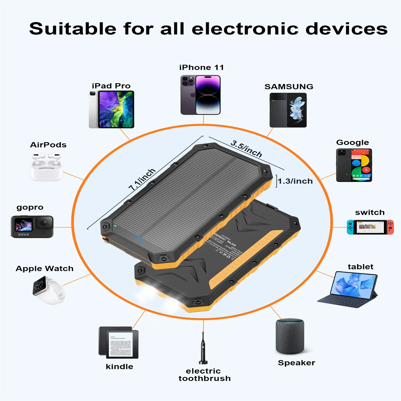 Multi-Functional LED Flashlight: Solar charger has built-in three modes LED flashlight (Steady-SOS-Strobe ), and lighting time can last up to 100+ hours when fully charged. Whether it is daily life, travel, hurricane prep, outdoor camping, cycling, fishing, hiking, kayaking, etc. This solar phone charger will all become part of your "traveling essentials bag".