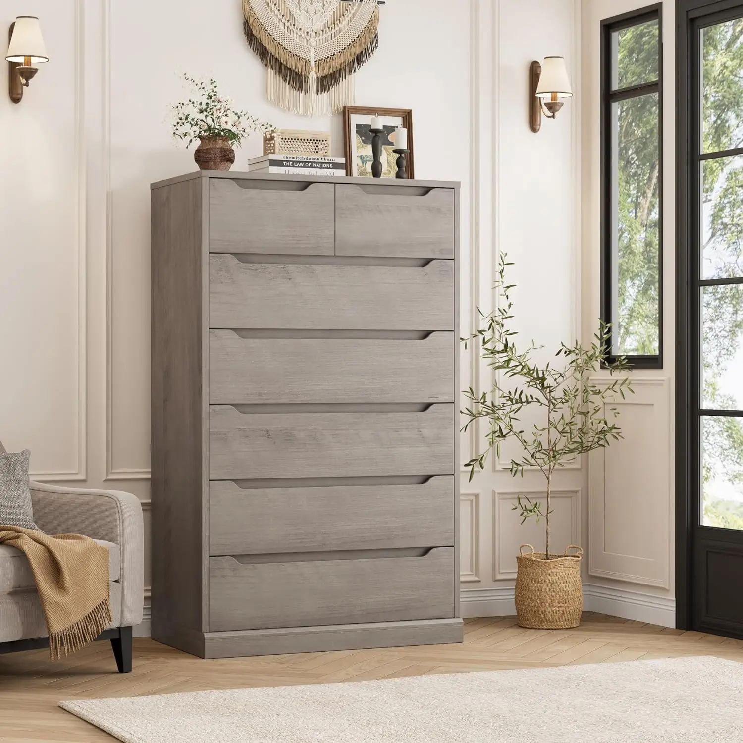 • Stylish Minimalist Look: Crafted with charming flat-front design, streamlined appearance, cut-out handles and extra tall body, this chest of drawer offers a place to store all your sundries and necessities in style while creating a striking contemporary style statement