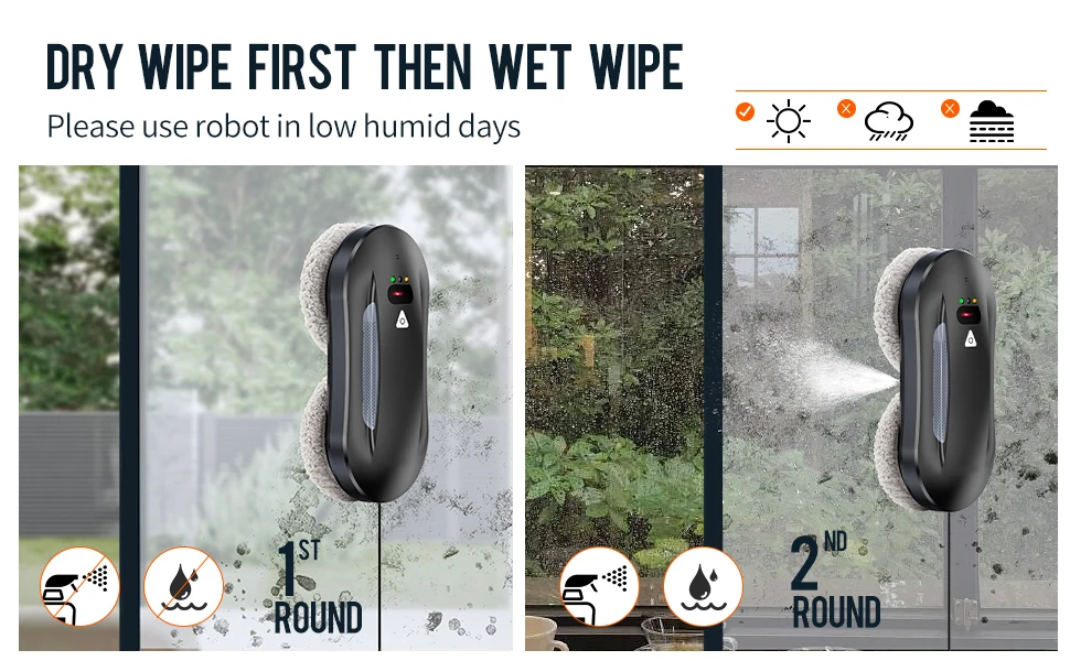 Automatic Water Spray: This window robot is designed with an automatic ultrasonic water spray function, which effectively cleans windows deeper and ensures that every corner of the glass shines brightly. Wide spray mode can keep the cleaning area wet for the best cleaning performance. Automatic/manual water spraying can be switched through the remote control. A 35 milliliter water tank is large enough to clean the windows in your home.