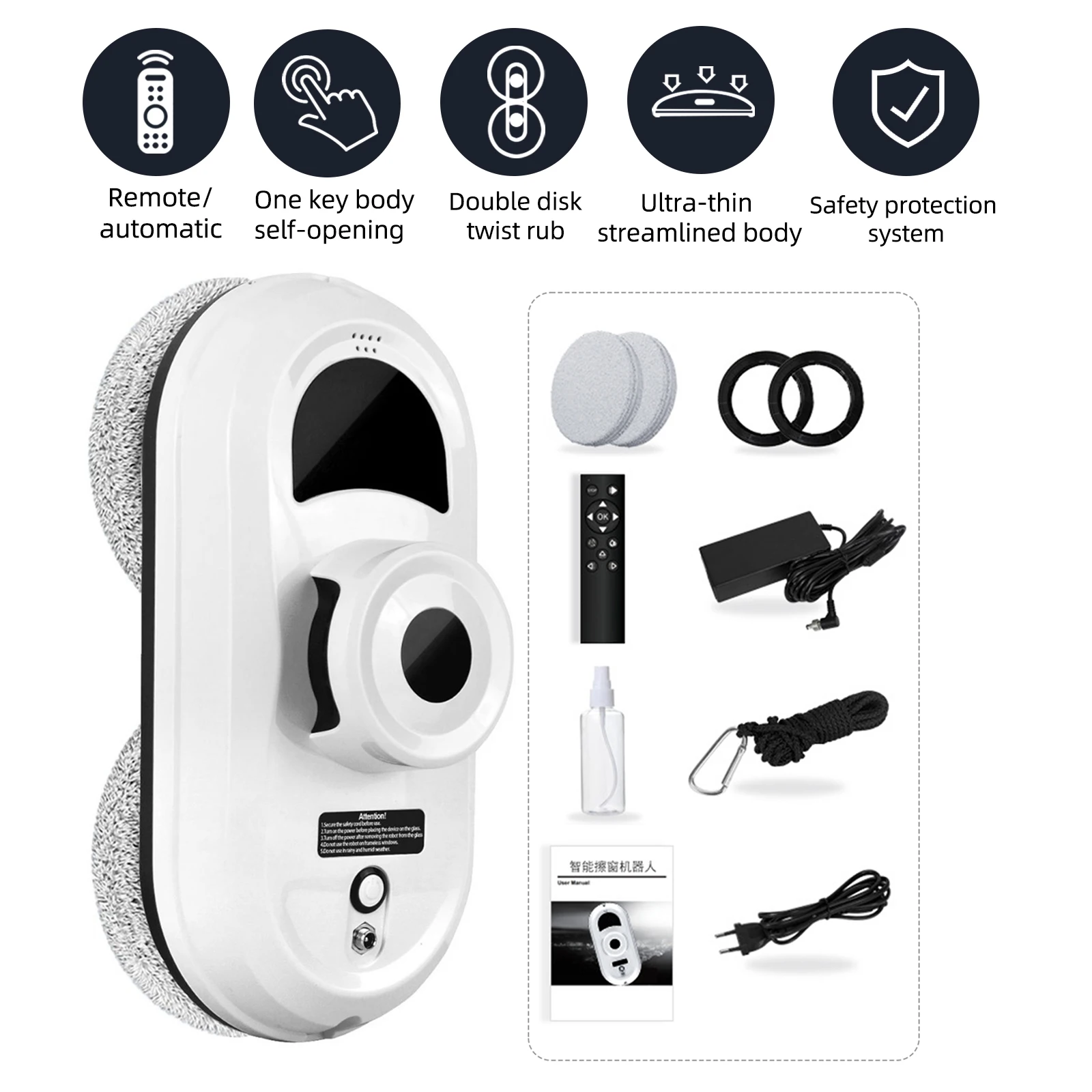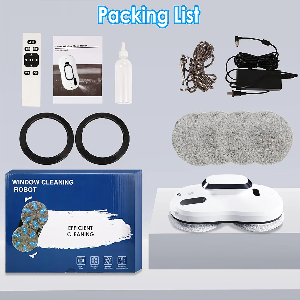 Delivery list: window cleaning robot, remote control, spray bottle, cleaning cloth *10, cleaning ring *4, power adapter, safety rope assembly, power cord
