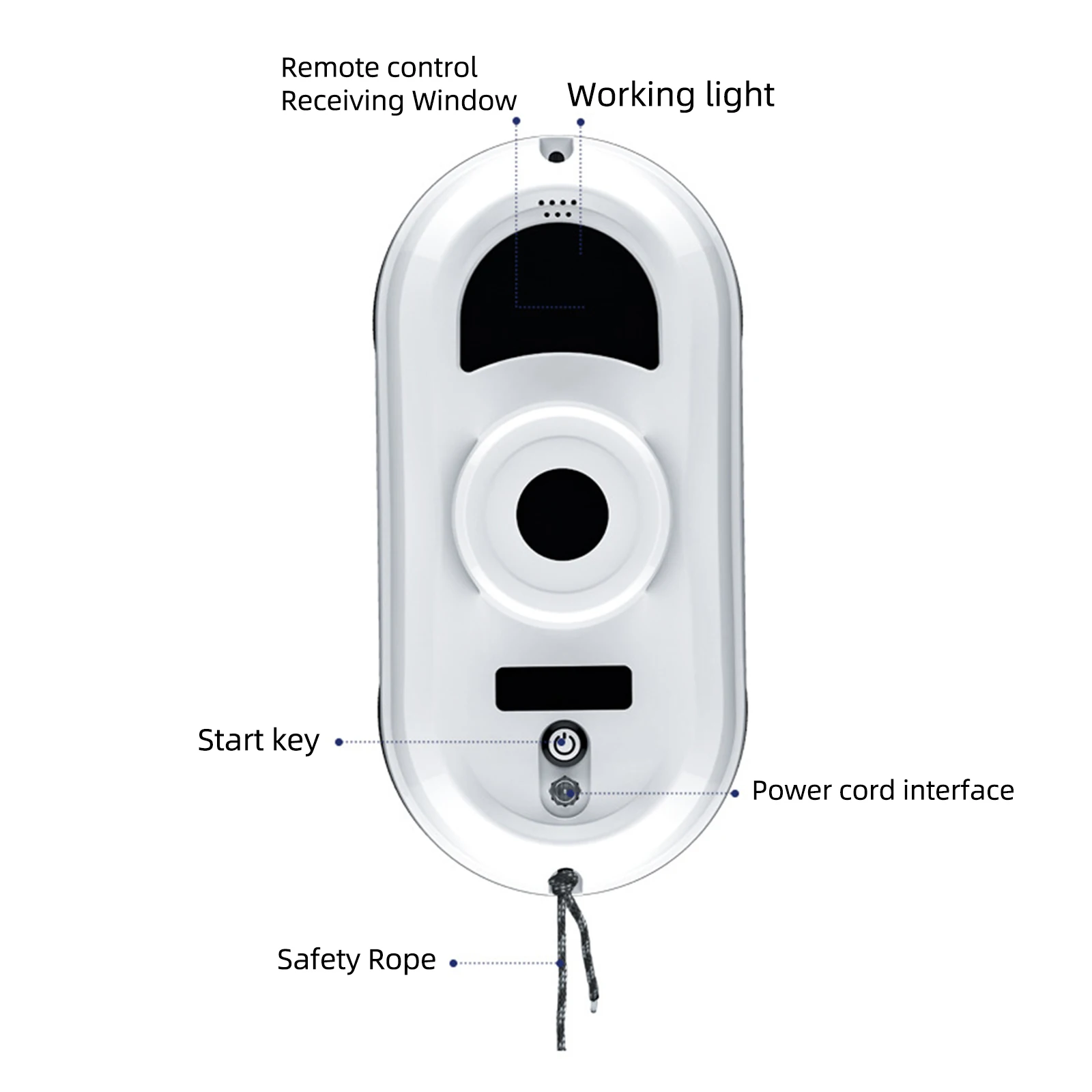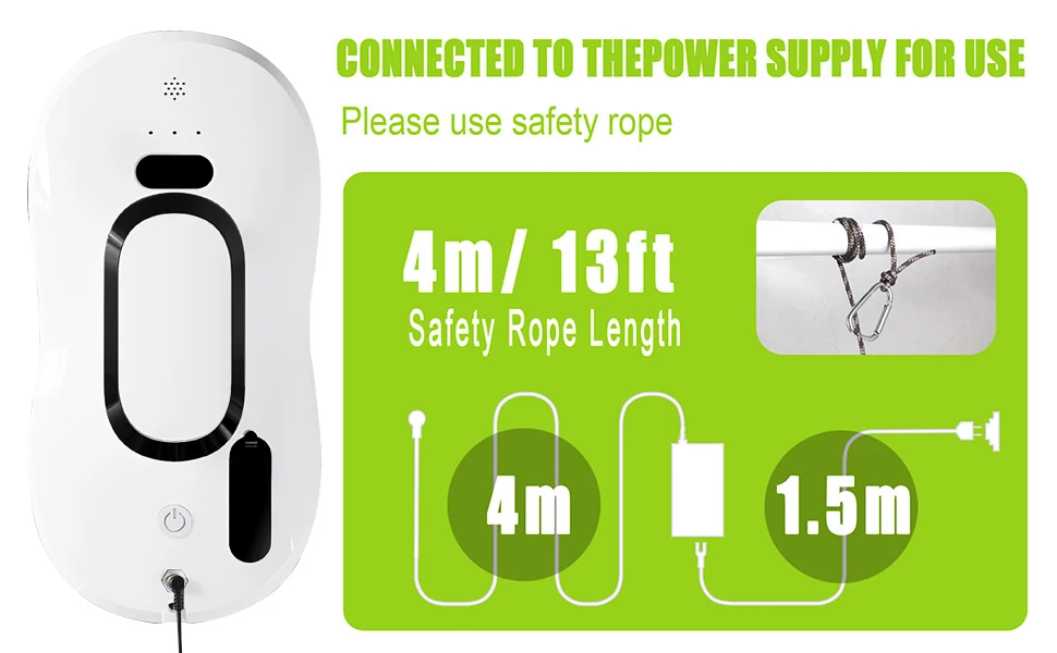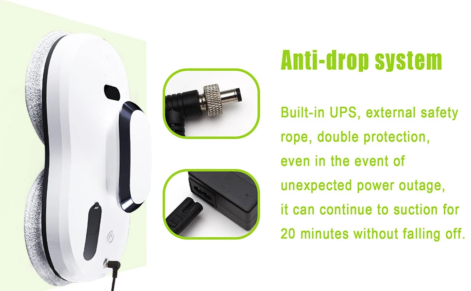 Safety system: Built in lithium-ion battery. If there is an unexpected power outage, the window cleaning robot can vacuum the glass with force for 20-30 minutes and sound an alarm. The automatic window cleaning robot is equipped with a 4m power cord and a 4m climbing rope high-quality safety rope to prevent accidental falls. The multiple protections of the window cleaning robot ensure the safety of window cleaning on high-rise buildings.
