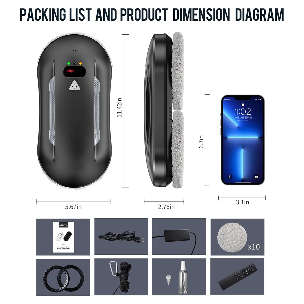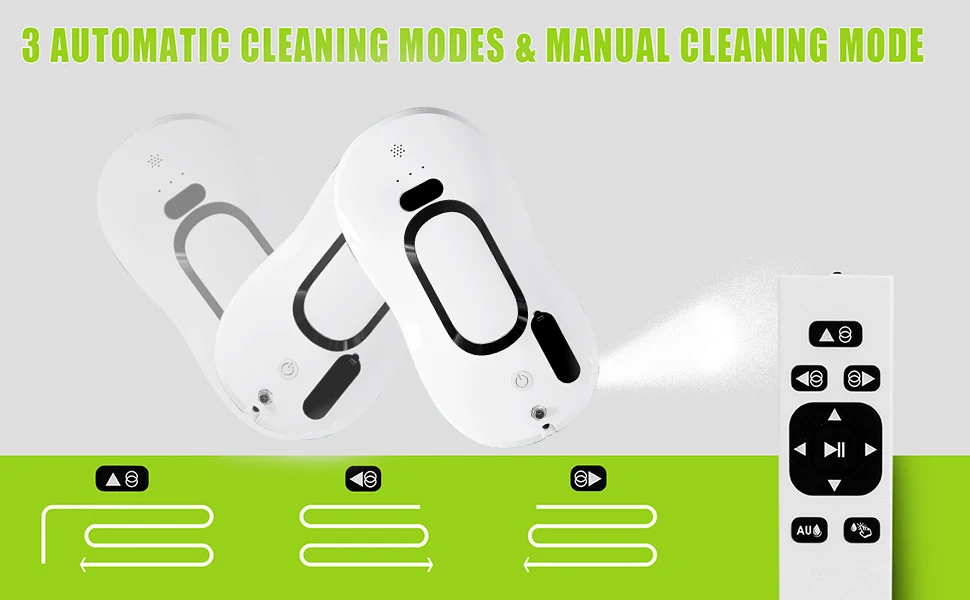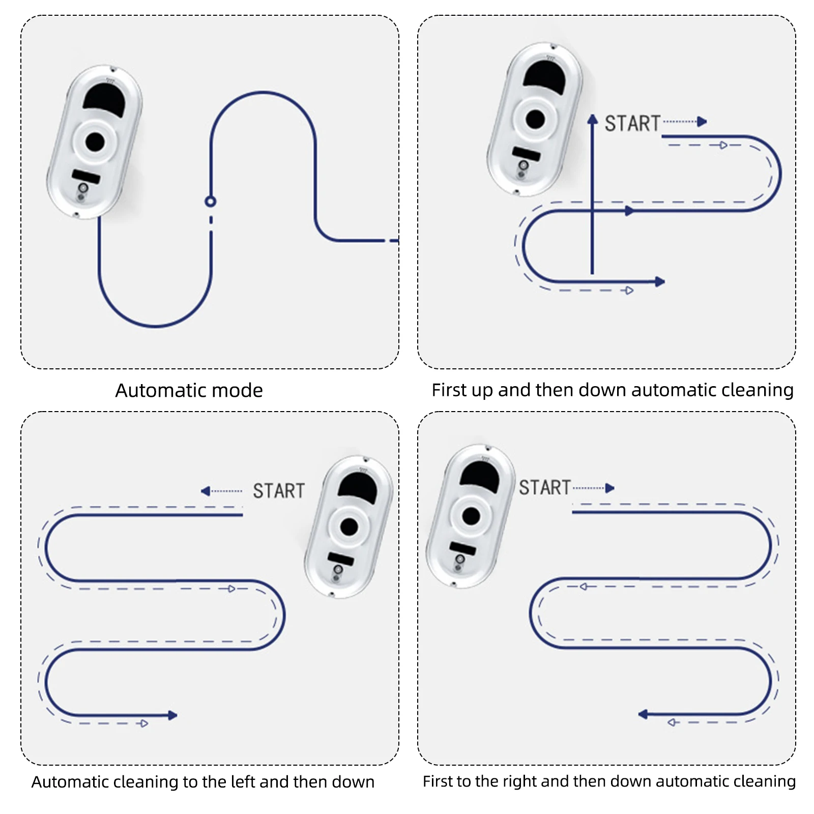 Intelligent window cleaning robot: One click start of the window cleaning robot, intelligent Z-shaped cleaning path planning, improves cleaning efficiency, and avoids missing areas. The remote control can adjust the window cleaning direction up, down, left, and right according to your needs for cleaning. High precision sensors detect edges and adjust cleaning paths, making them suitable for framed and frameless glass