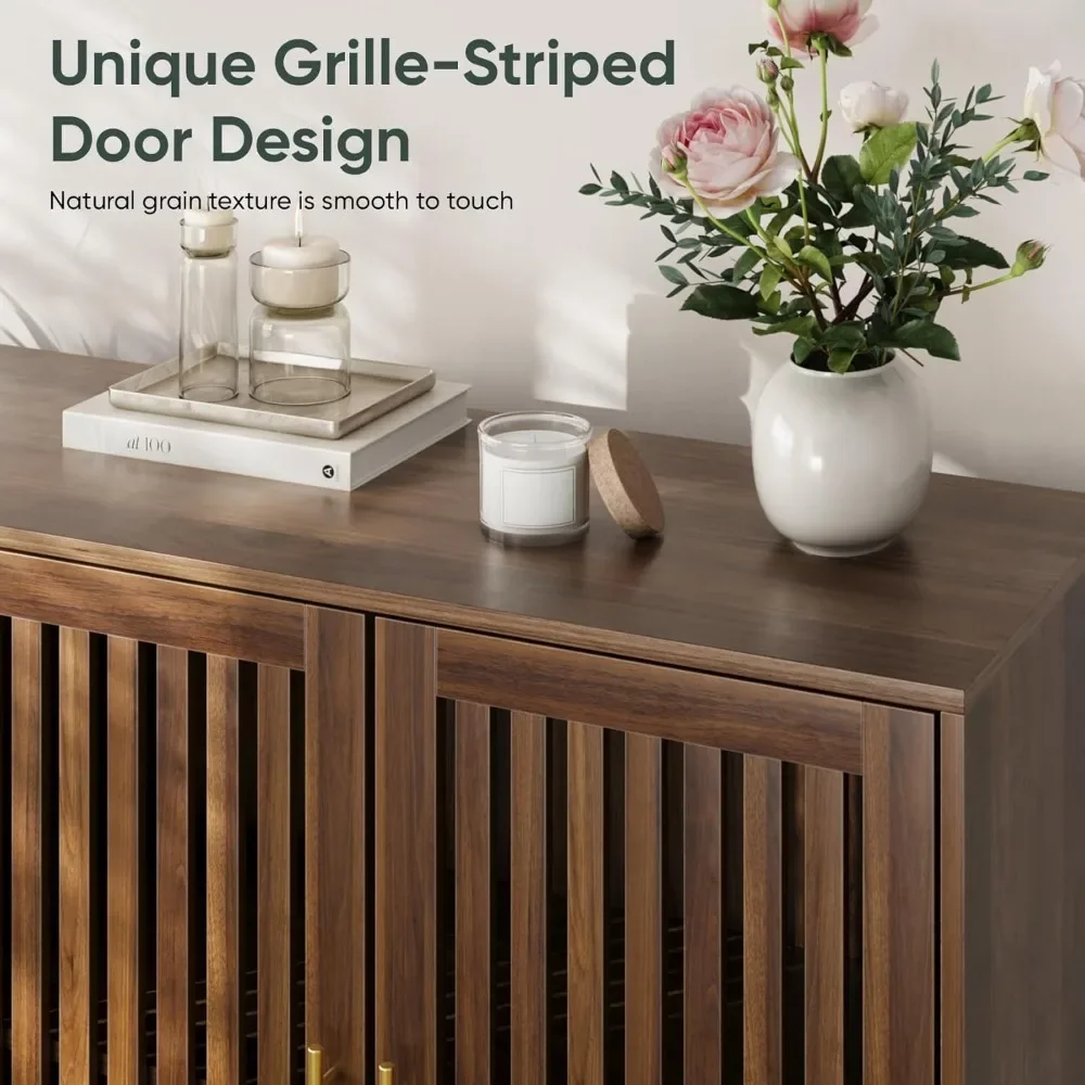 【Modern Farmhouse Storage Cabinet】This walnut storage cabinet features unique slatted doors, beautifully combining rustic charm with modern elegance. Its eye-catching design will add a striking touch to almost any room