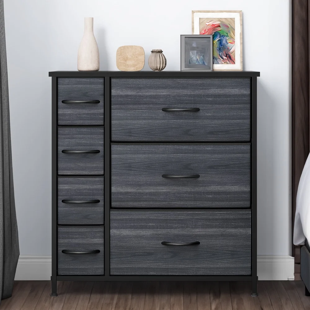 Designed with a sturdy metal frame, an MDF wooden top, and breathable fabric drawers, this dresser provides ample space for organizing clothes, accessories, and household essentials.  The seven ovable drawers glide smoothly for effortless use, while the modern black design complements any décor.  Assembly is quick and hassle-free with all necessary hardware and instructions included.   is prioritized with a wall-anchoring kit to prevent tipping.  I for adults, teens, and children, this compact yet spacious dresser maximizes storage without taking up much space.  Dimensions: 25" L x 11. 8" W x 28. 7" H, Item Weight: 16. 87 lbs.