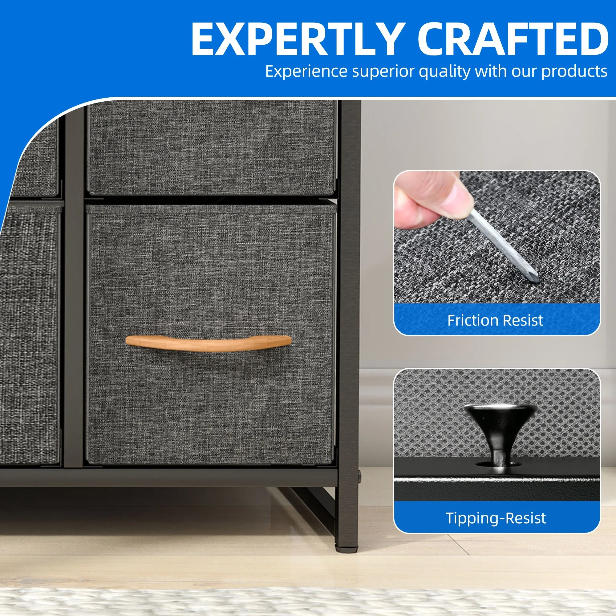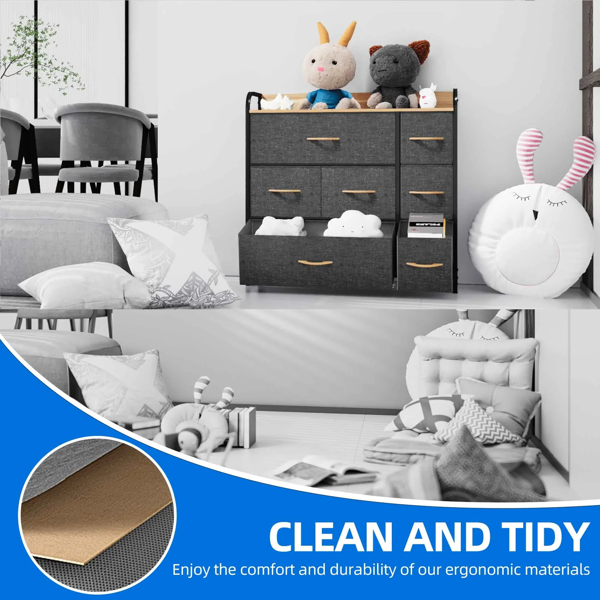 • UNIVERSAL MATCH - Premium fabric drawers, steel frame, and waterproof wooden tabletop give the storage organizer a modern style. This unit easily fits in various living spaces: living rooms, bedrooms, hallways, entryways, closets, and nurseries, etc.