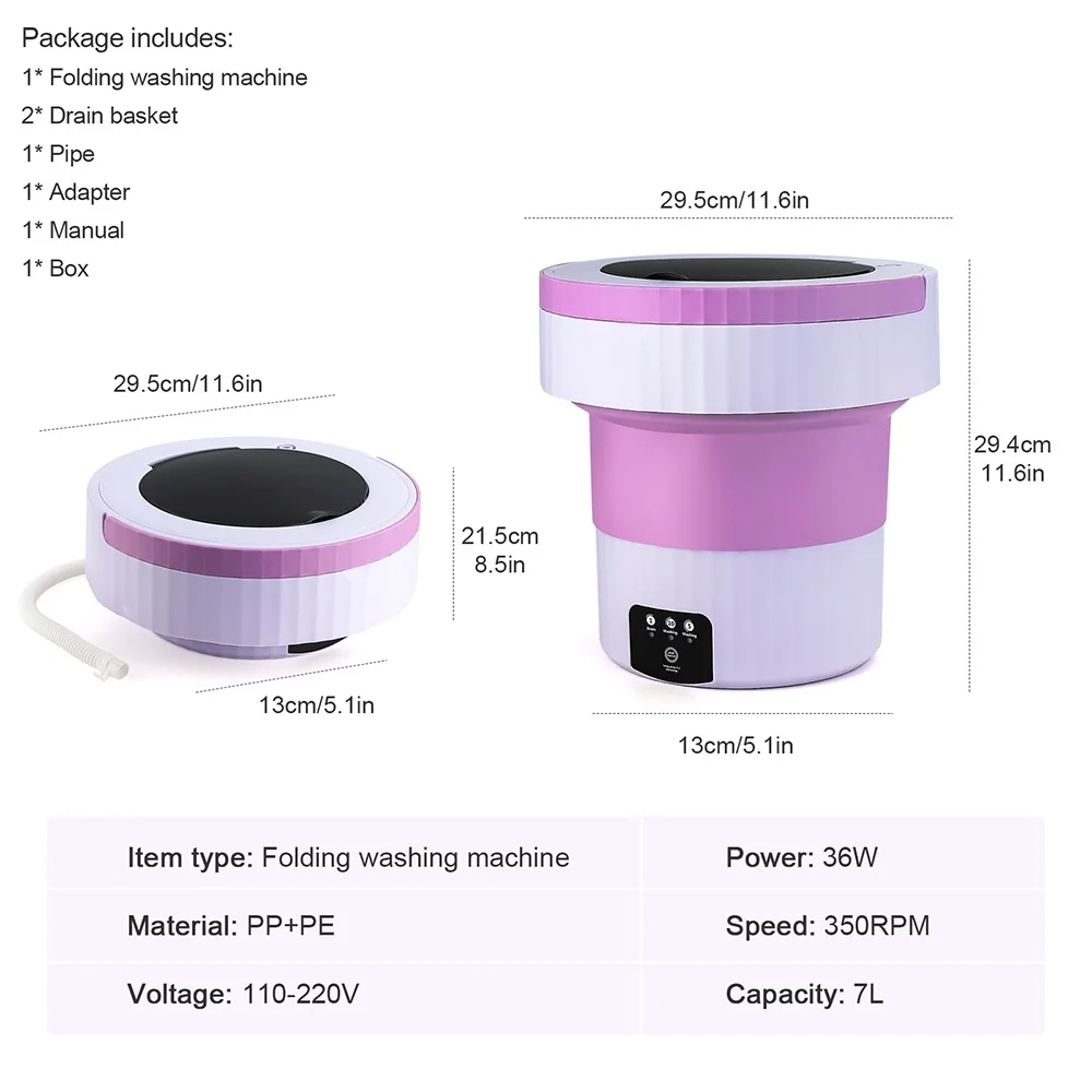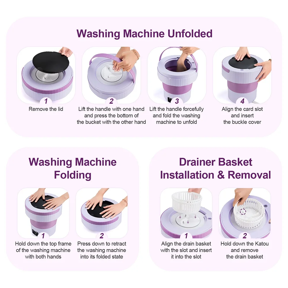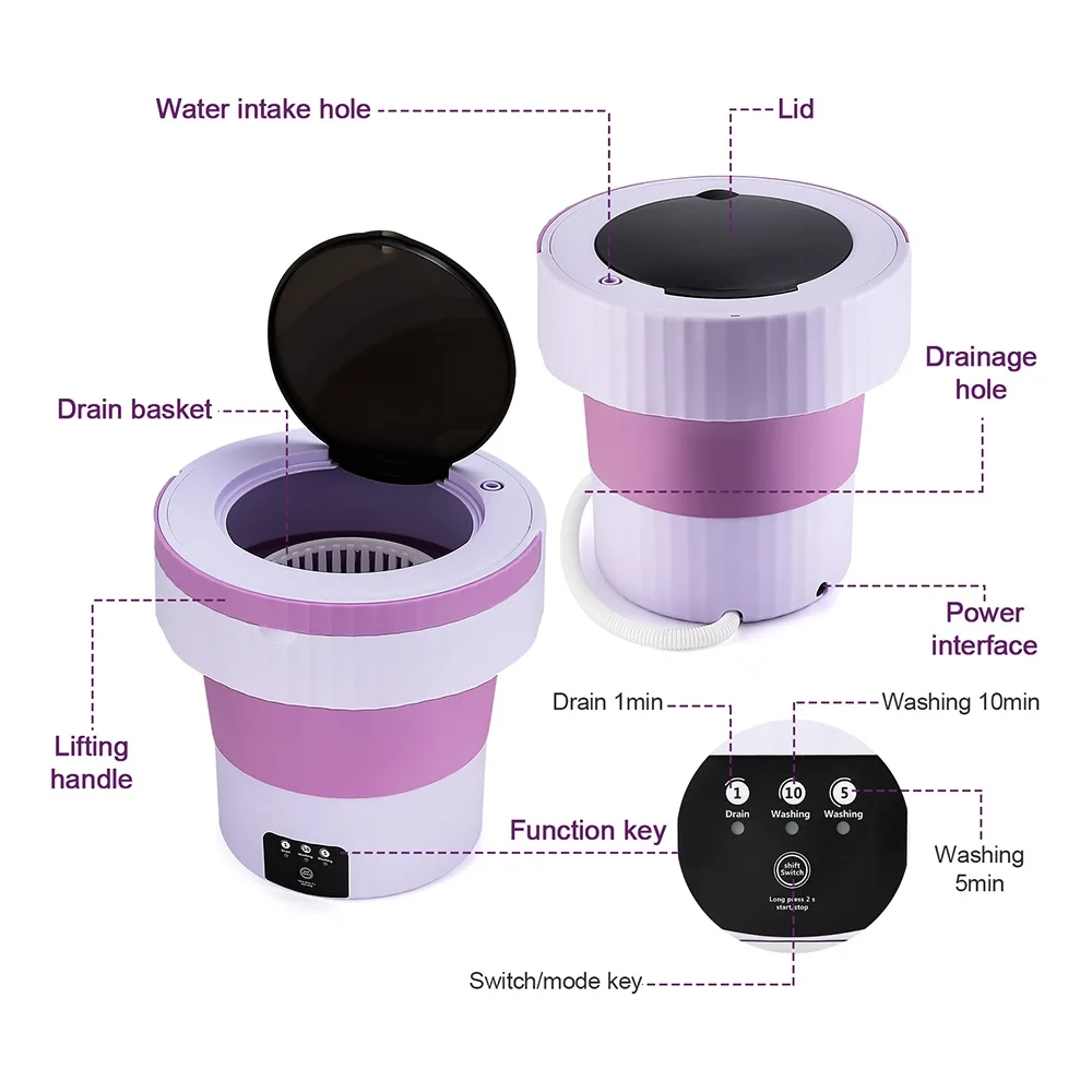 1.Portable Washing Machine. The small washing machine provides a drain pipe and Coming with blue ray function, compact and easy to carry, it is an ideal choice for your apartment, dormitory, RV, travel or camping.