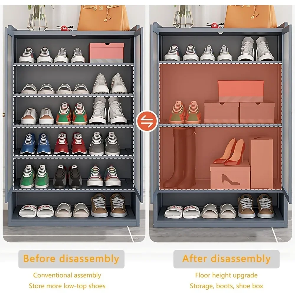 【Storage Assistant】The shoe rack with six closeable compartments, one top platform, and one open compartment enable multi-function storage, allowing you to quickly put on and take off shoes and store them in the open compartment. Multi layer storage allows you to categorize shoes for a neat lifestyle.