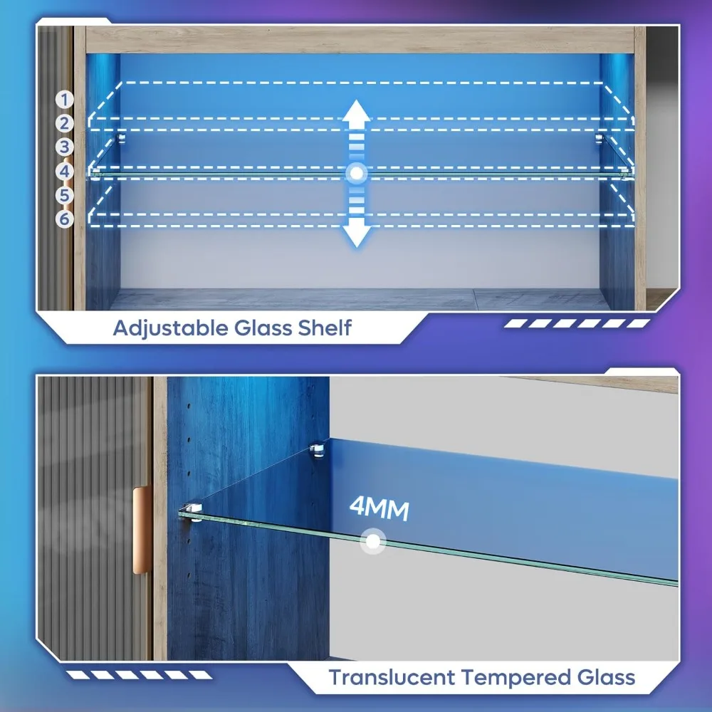 This modern LED TV stand is designed to enhance your living space with its sleek design, perfect for any decor. It features built-in LED lights that offer 7 different colors and 22 adjustable modes, allowing you to personalize your entertainment area with an RGB remote control for a vibrant and dynamic experience. The TV stand provides an efficient storage solution with open storage space and two closed cabinets. The acrylic doors protect your equipment from dust while maintaining visibility. The 3-tier multi-compartment layout offers ample storage for gaming consoles, media devices, and more. Cable management holes at the back ensure a clean and organized appearance. The stand features adjustable tempered glass shelves that can be set to 5 different heights, providing a sturdy platform for your items. When illuminated by the LED lights, your TV cabinet becomes an eye-catching display, showcasing your treasured items beautifully. This entertainment center is designed to accommodate TVs up to 80 inches, with dimensions of 70.8 inches in length, 13.7 inches in width, and 20.6 inches in height. Crafted from premium P2-grade particleboard, it offers a balance of safety and durability. The top shelf can support up to 176 lbs, ensuring reliable support for your TV and daily essentials. Assembly is effortless with all necessary hardware, tools, and detailed installation instructions included. Two people can complete the installation in about an hour. A product installation video tutorial is also available for your convenience. If you have any questions, feel free to reach out for assistance.