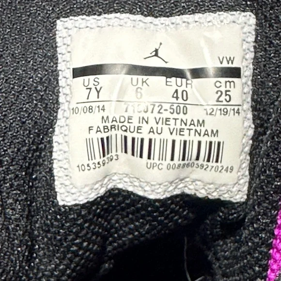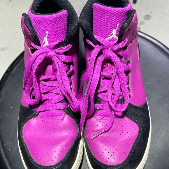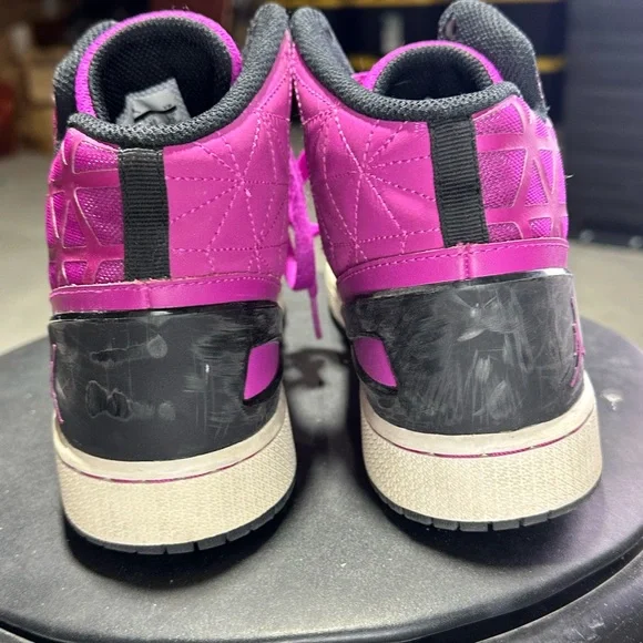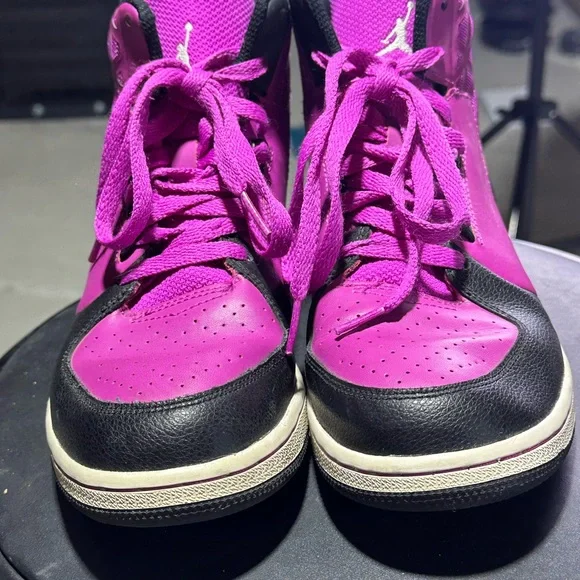 Size 7Y Air Jordan Retro High-Top Sneakers in Vivid Pink and BlackDescription: Step into bold style with these high-top Air Jordan sneakers, featuring a vibrant pink leather body contrasted with black accents. The iconic geometric pattern and the signature Jumpman logo create a striking look. These lace-up sneakers offer a classic basketball silhouette with a fashion-forward twist. The padded collar and perforated toe box add comfort and breathability, making them a perfect blend of sporty and streetwear chic.Condition Rating: 7/10Reason for Rating: These sneakers show moderate signs of wear on the soles and slight creasing on the leather. There are no major stains or damage, retaining most of their original shape and color vibrancy.