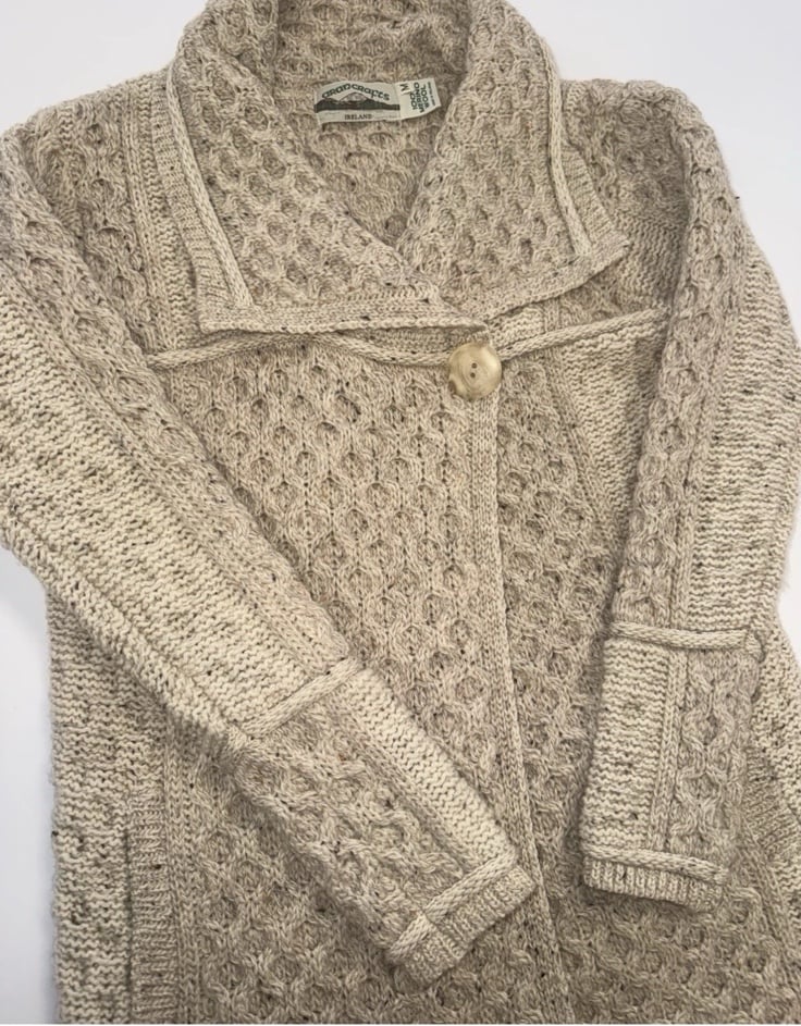 The Aran Crafts Women’s 1 Button Cardigan Sweater is a stylish and cozy garment made from 100% Merino Wool in Ireland. This solid beige sweater features a collared neckline, long sleeves, and a button accent for a classic look. Designed for casual occasions, this cardigan is perfect for the winter, fall, and spring seasons. The knit fabric type adds a touch of luxury to this timeless piece that is easy to care for with dry clean only instructions. Perfect for women looking for a high-quality and fashionable addition to their wardrobe.