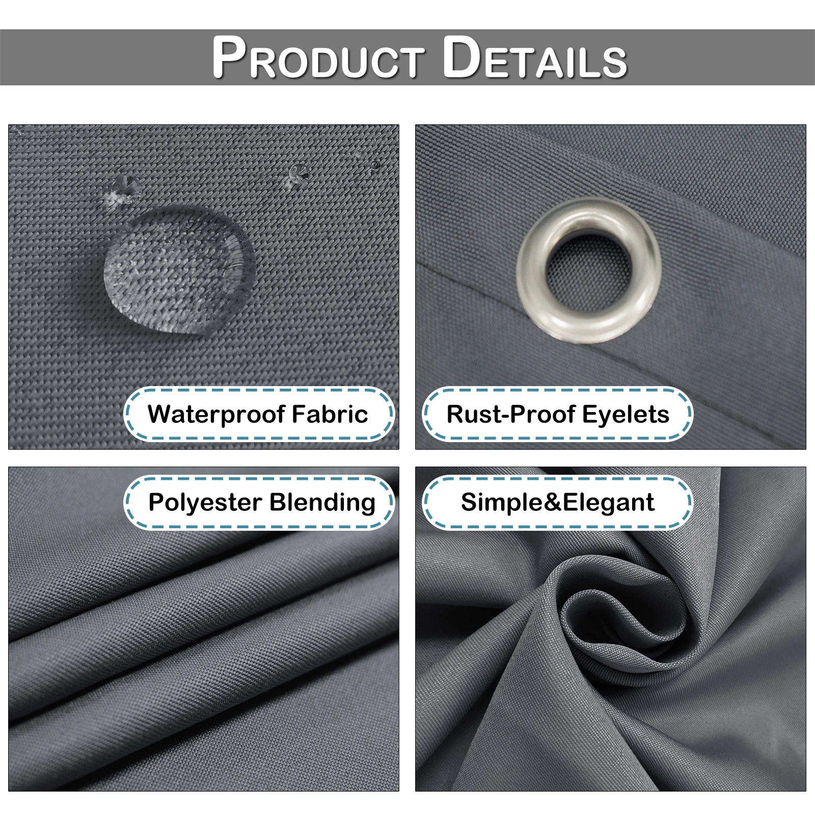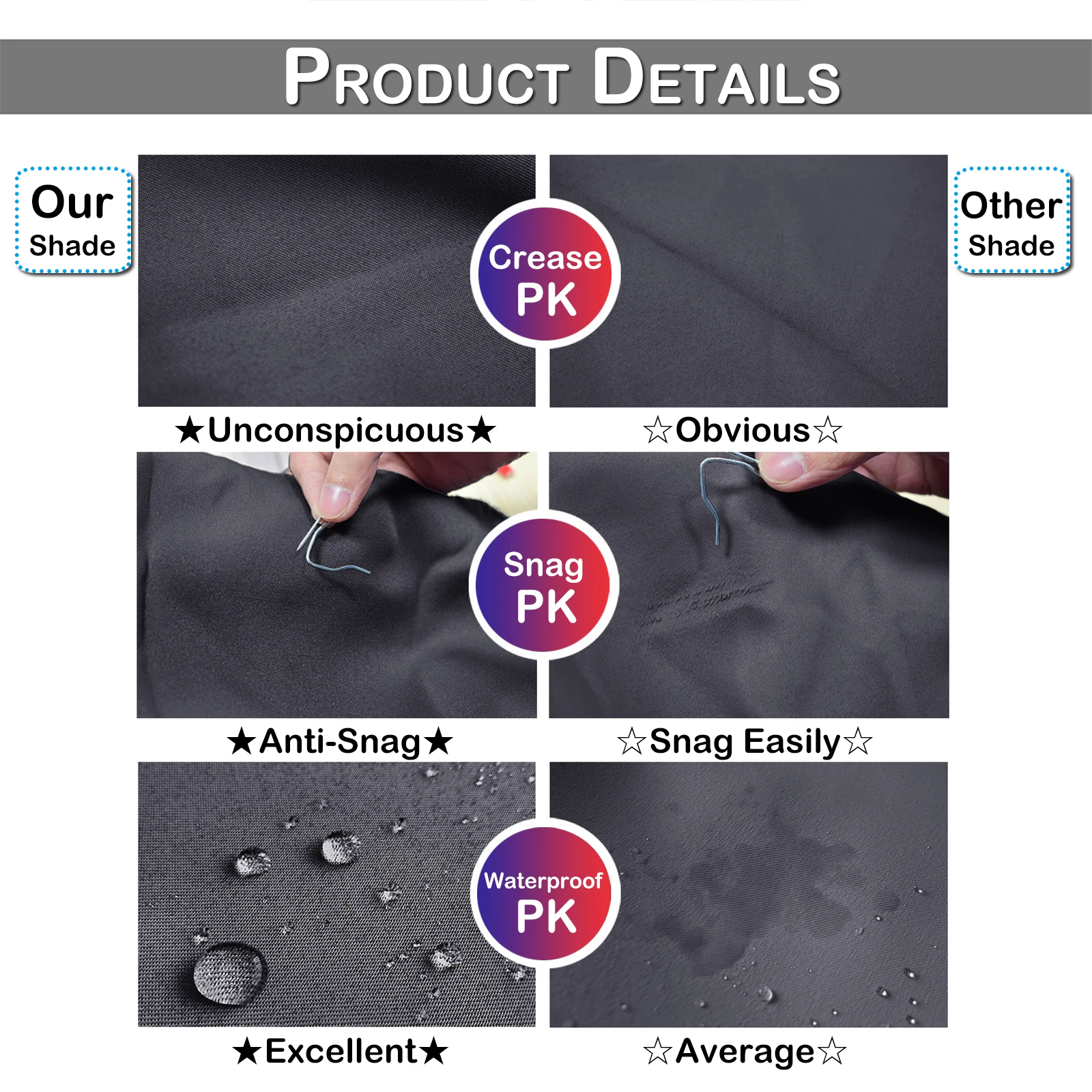 Waterproof---Made of 100% Polyester, 70% heat and light-blockingwaterproof fabric. The privacy cover provides you with a private space in your patio life and keeps UV rays and rain away from you. Block stray or unwanted light, and keep noise.
