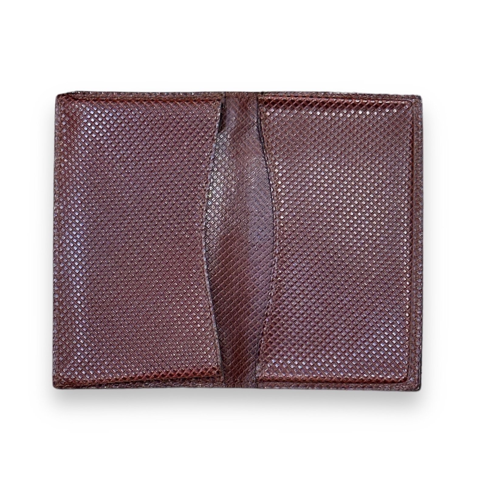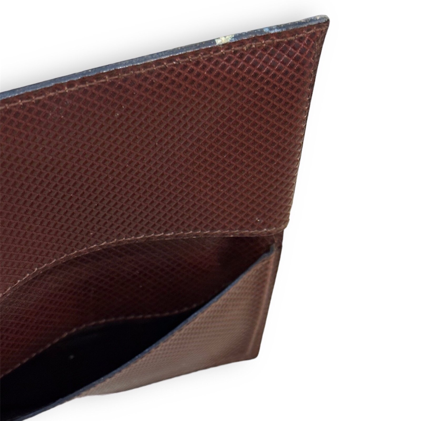 Very simple and convenient Bottega cardholder embossed in burgundy / dark maroon leather. Features 2 card slots, gold printed logo on the interior, and unique design in one of the pockets. Very lightweight, making it the perfect pocket organizer.