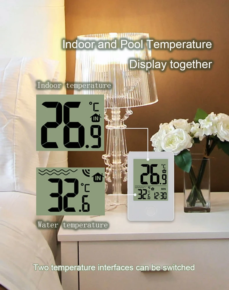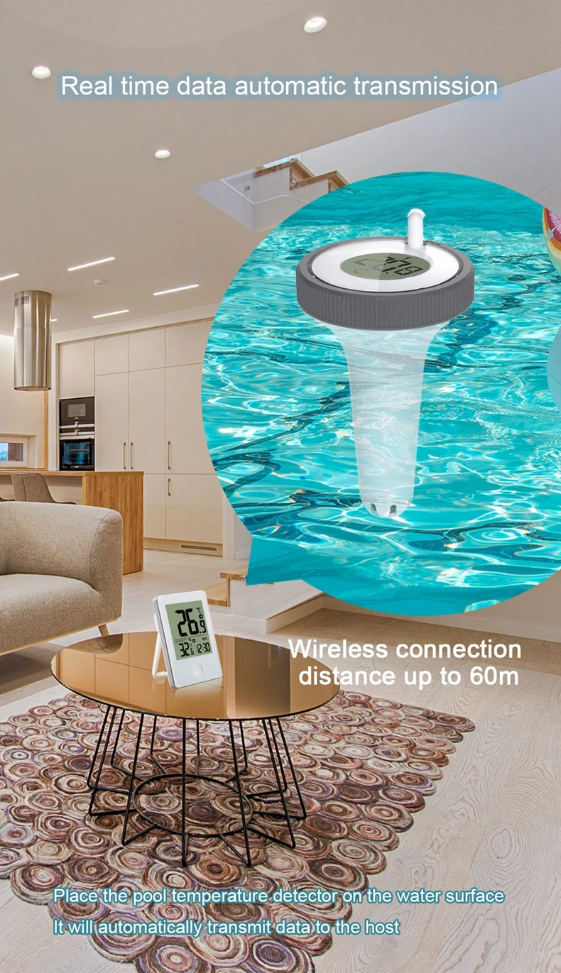 (Explosive products in summer) The host is placed indoors to check the time, temperature and humidity and other data. The transmitter is placed in the outdoor pool to obtain data and then transmitted to the host. Outdoor sensor transmission distance of 60 meters. Upgrade and optimize the waterproof sealing, to ensure that the product will not leak, resulting in bad product problems.