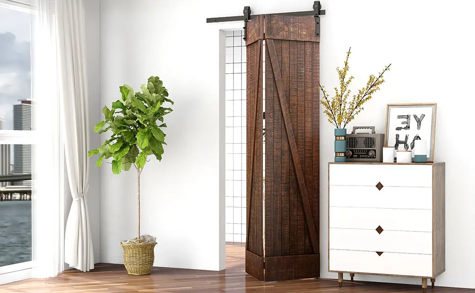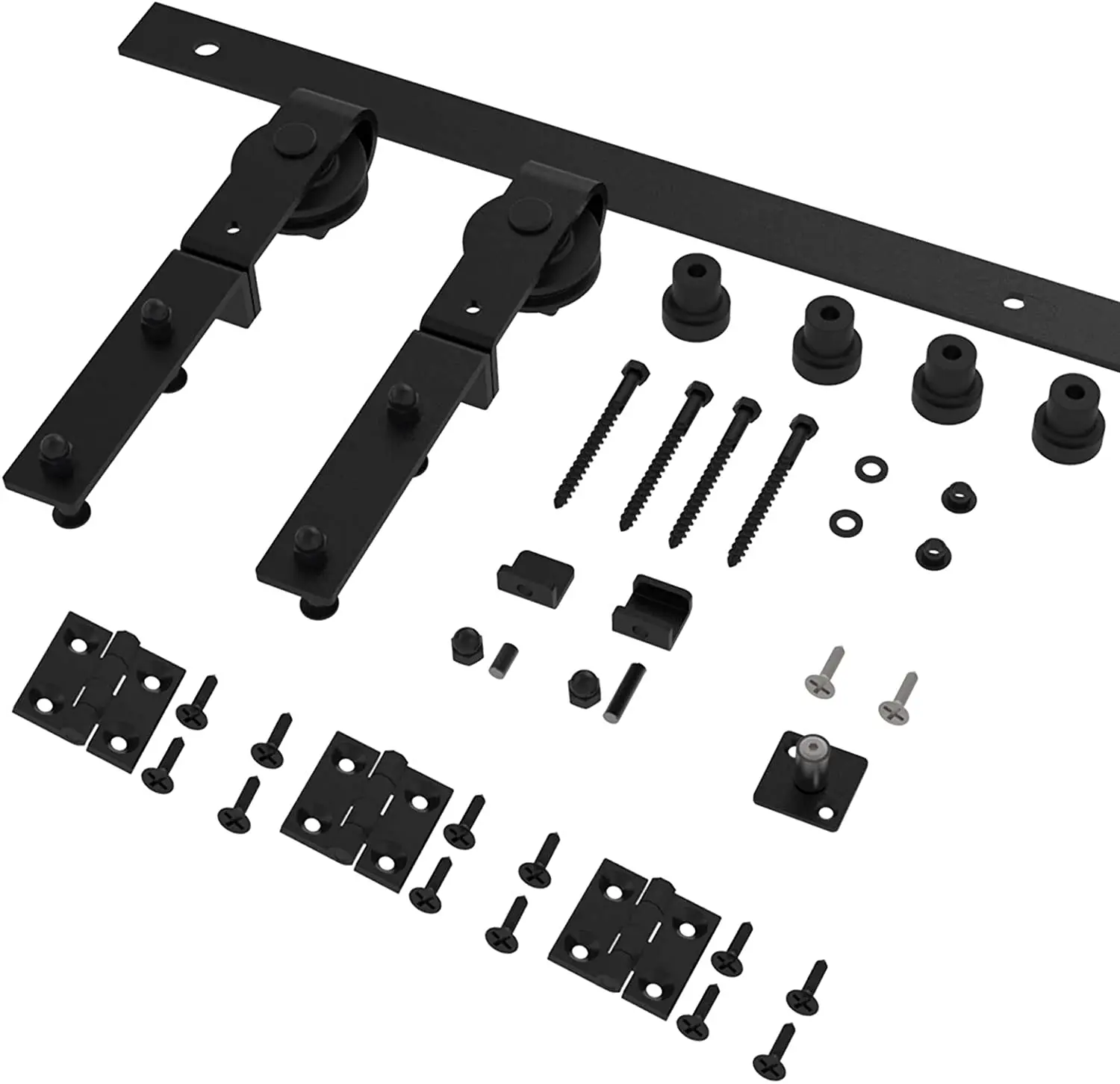 Spliced rails, rail connector, 2x Hanging Pulley, 2x door stopopers, 2x anti-jump disks, 1 rotating shaft, all hardware needed for bi-folding door. 1x instructions installation.