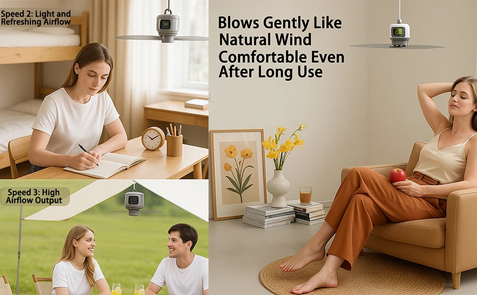 VERSATILE USAGE: This portable ceiling fan is suitable for door corridor, living room, bedroom, kitchen, garage, indoor, gazebo, cool garden, outdoor, camping, RV, tent, room, attic, basement and other scenes