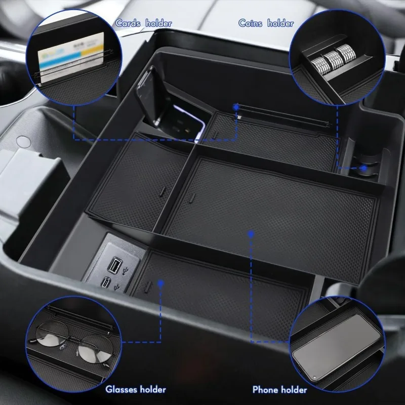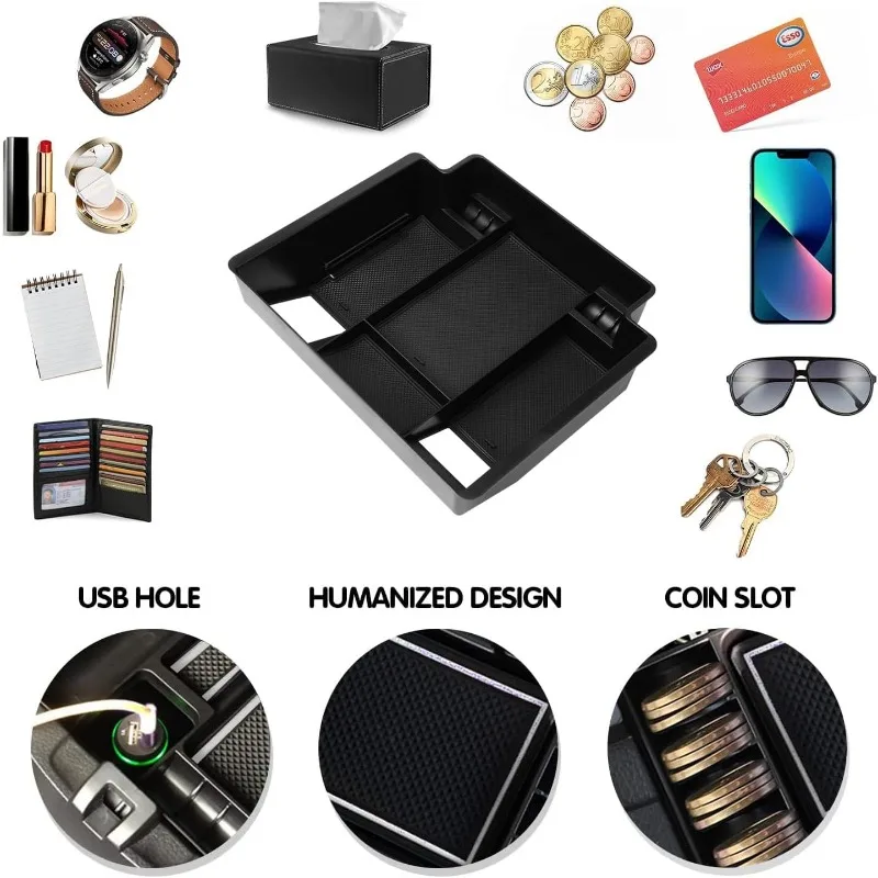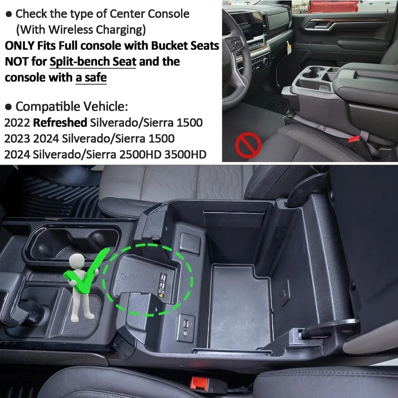 【Design for Sierra&Silverado】Center Console Organizer fits refreshed model with wireless charging 2023 2024 Sierra 1500 and New 2024 2025 Silverado/Sierra 2500HD 3500HD- (Full Console w/Bucket Seats ONLY) , design for Sierra&Silverado accessories. Just Fits Front bucket seats. If you are not sure whether the internal shape of your armrest box is suitable, you can refer to Figure 2 before purchasing.