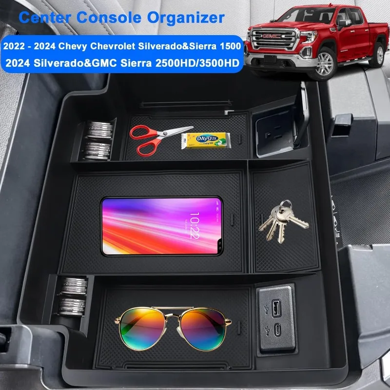 Center Console Organizer Compatible with 2022 2023 2024 Chevy Silverado & Sierra 1500/2024 2025 Silverado&GMC Sierra 2500HD/3500HD Accessories Armrest Storage Box(Only Fit Full Console w/Bucket Seats)