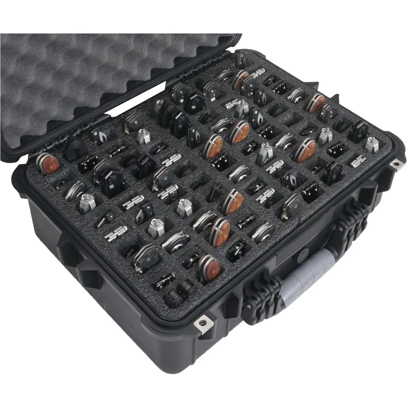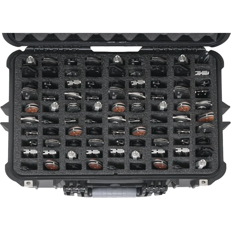 [Case Hardware] Shell is made of injection molded high strength copolymer polypropylene plastic with ribs for additional structural reinforcement. 4 strong latches keep the case securely closed; 2 metal reinforced padlock holes keep your contents protected; stainless steel hinge pins for added strength; pressure relief valve for changing altitudes; rubber over-molded handle for comfort; and a gasket seal keeps out water, dust, dirt and other foreign debris.