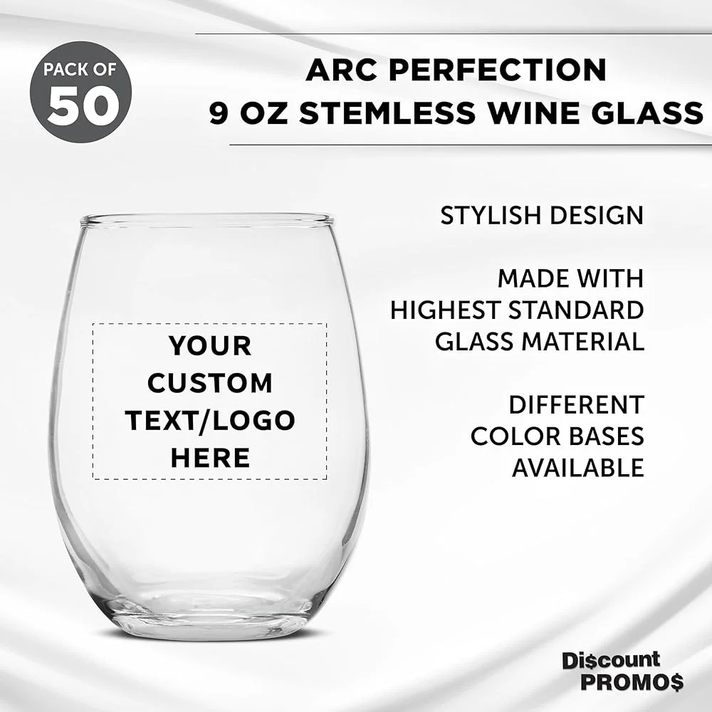 About this item    TASTING GLASS - SMALLER SIZE - 9 ounce glass size is perfect for wine tasting.  Chic and stylish glassware ideal for around the home, restaurants, bars, hotels, special events such as holiday parties or corporate events.     STYLISH CONTEMPORARY DESIGN - These small stemless drinking glasses are available in with different colors colors at its base.  Perfect for matching your theme or décor.  Presenting your brand can never be this stylish perfectly ideal for tradeshows, conventions, corporate meetings, weddings, souvenirs, give away items, or other events.     CUSTOMIZABLE & AVAILABLE IN VARIOUS COLORS - Available with a base in clear, blue, black, green , red, or purple.  Order our stemless wine glasses etched or engraved and add your brand name, logo, and event dates.  Or purchase blank and enhance your décor.     HAND WASH ONLY - Each piece is painted and heat sealed to provide an authentic appearance while ensuring durability.  Abrasive washing, extremely hot water, and harsh cleaning solutions can wear the paint coating.  Please hand wash carefully to preserve the vibrant colors that you will love.     PRINTED in USA – Only one color decoration allowed.
