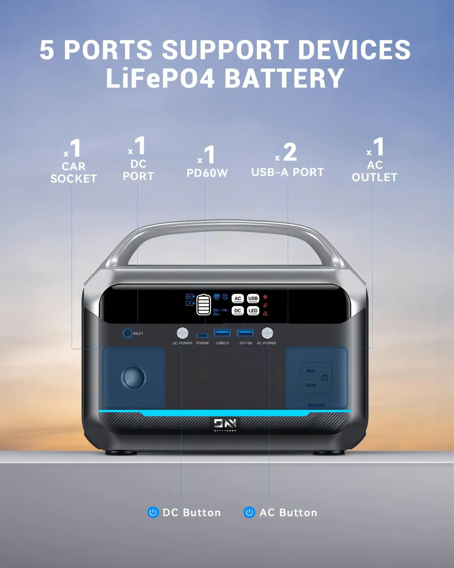 2.LCD display, AC/DC indicator for battery capacity, easy to control battery power