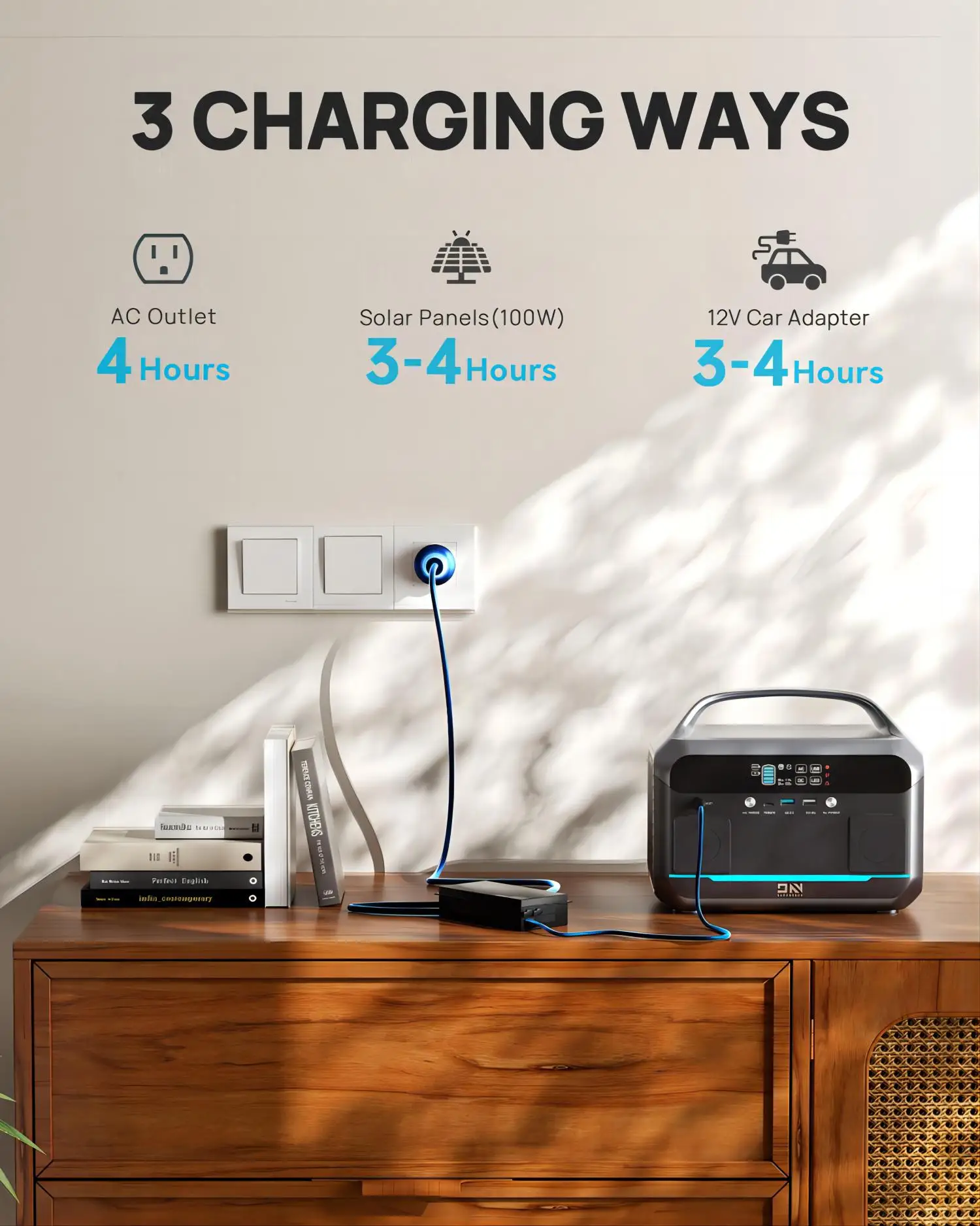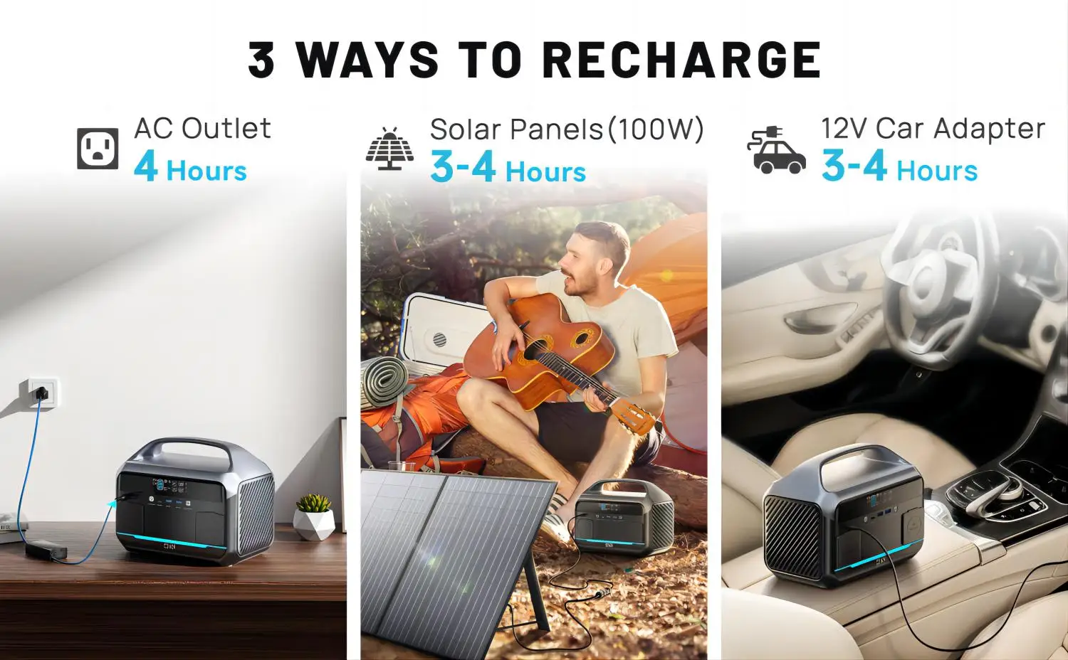 Another TWO recharging ways for the power station: an AC wall outlet (included) and DC (with cigarette lighter).