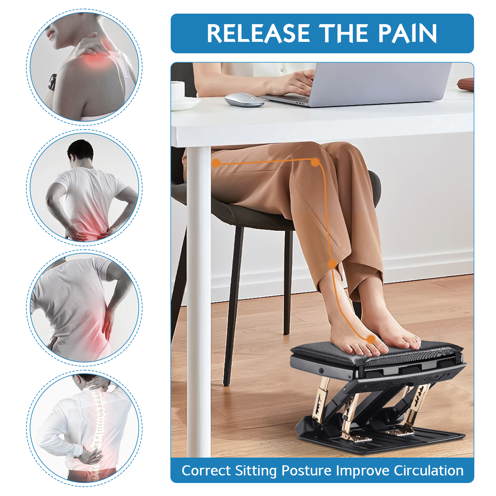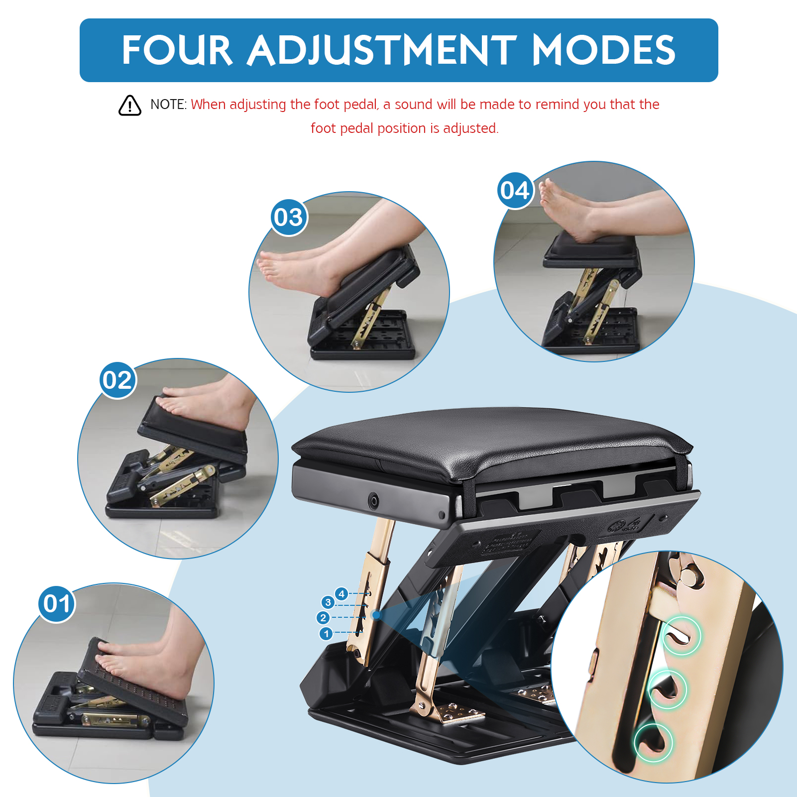 Adjustable height and angle: footrest desk with 4 height levels and 3 adjustable tilt angles. Total 12 modes. This allows your feet to be fully stretched, which makes it super easy to find the perfect position for your needs, and very important for long sitting.