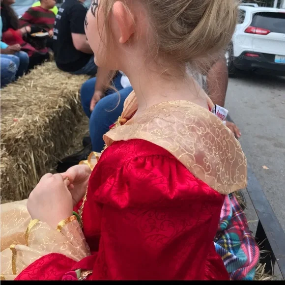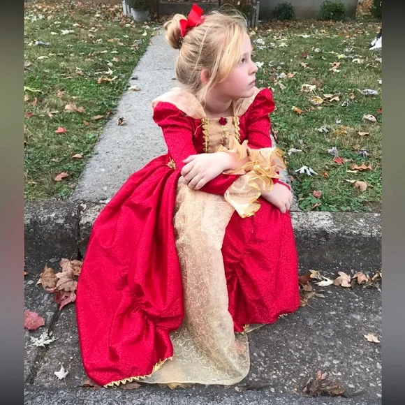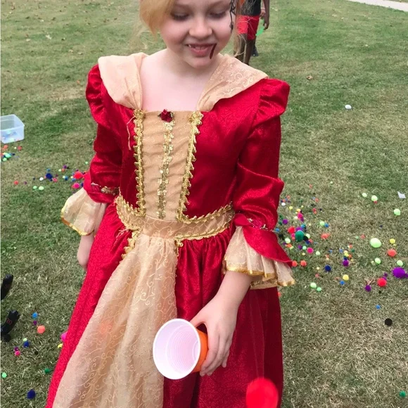 Disney Red Belle dress costume. High quality. Lots of tiers of tool. So much detail. Great for dress up or Halloween parties. In great preloved condition. One flaw the back upper button doesn’t latch anymore, I used a safety pen. Mrsp $150 official Disney store. Fits 10-16 girls well I’d say. Fast shipping before Halloween. Preloved condition could have stains, tears, flaws not visible in images. Overall good condition