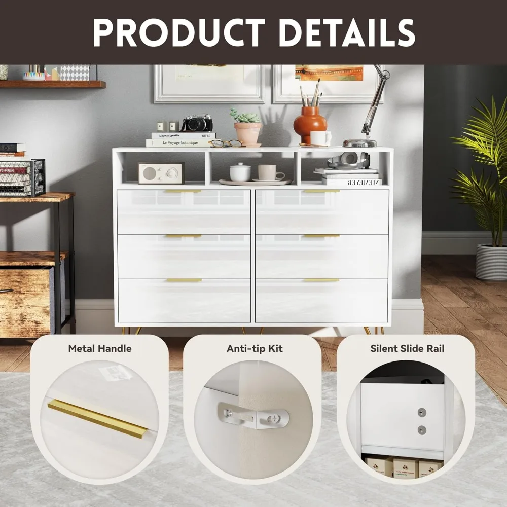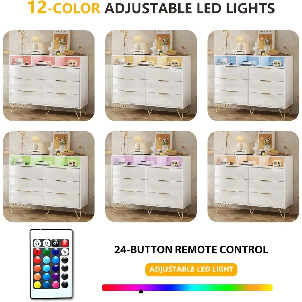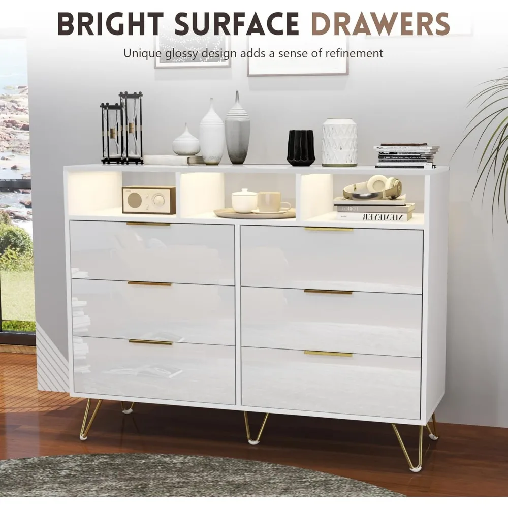 Dresser for Bedroom, High Gloss 6 Drawer Dresser with Led Lights, Modern White Dressers with 3 Open Shelves, Wood Wide Chest of
