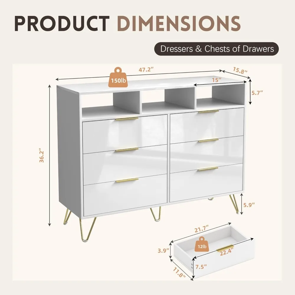 • High-Quality Material and Design: Our chest of drawers are made of sturdy triangular iron frame and UV high-quality finish, which are more durable and suitable for long-term use. They are equipped with non-slip foot pads, which not only protect your floor but also increase safety.