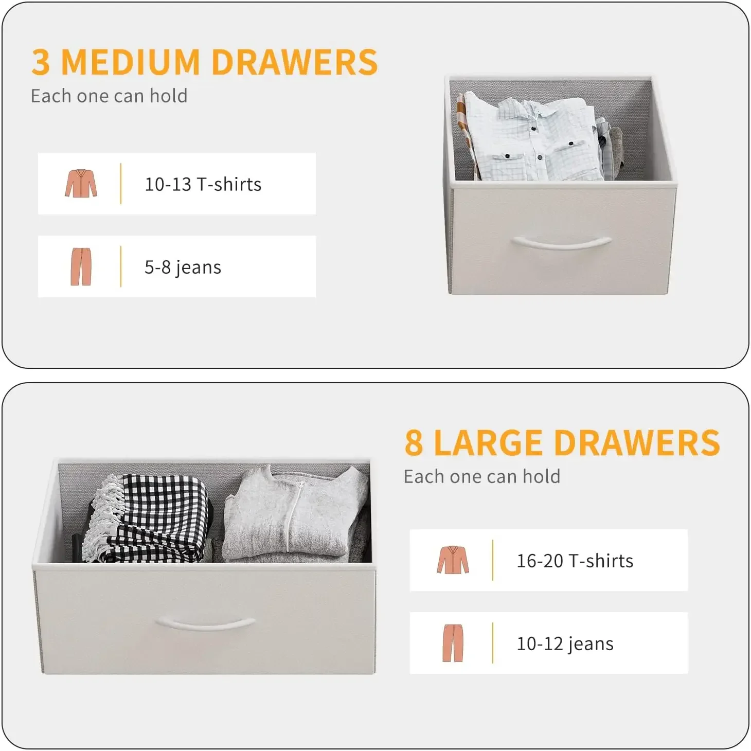 - [11-Drawer Dresser For Storage] Chest of Drawers Designed with 11 individually collapsible drawers, including 3 drawers for small items, 2 drawers with 2 compartments for medium size items and 6 large size drawers for Large size items. The fabric dresser for the bedroom offers endless organizational possibilities.