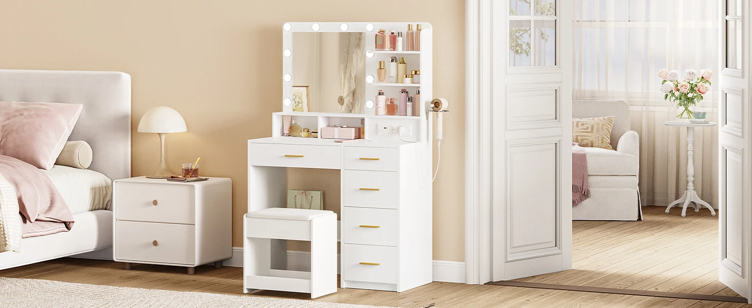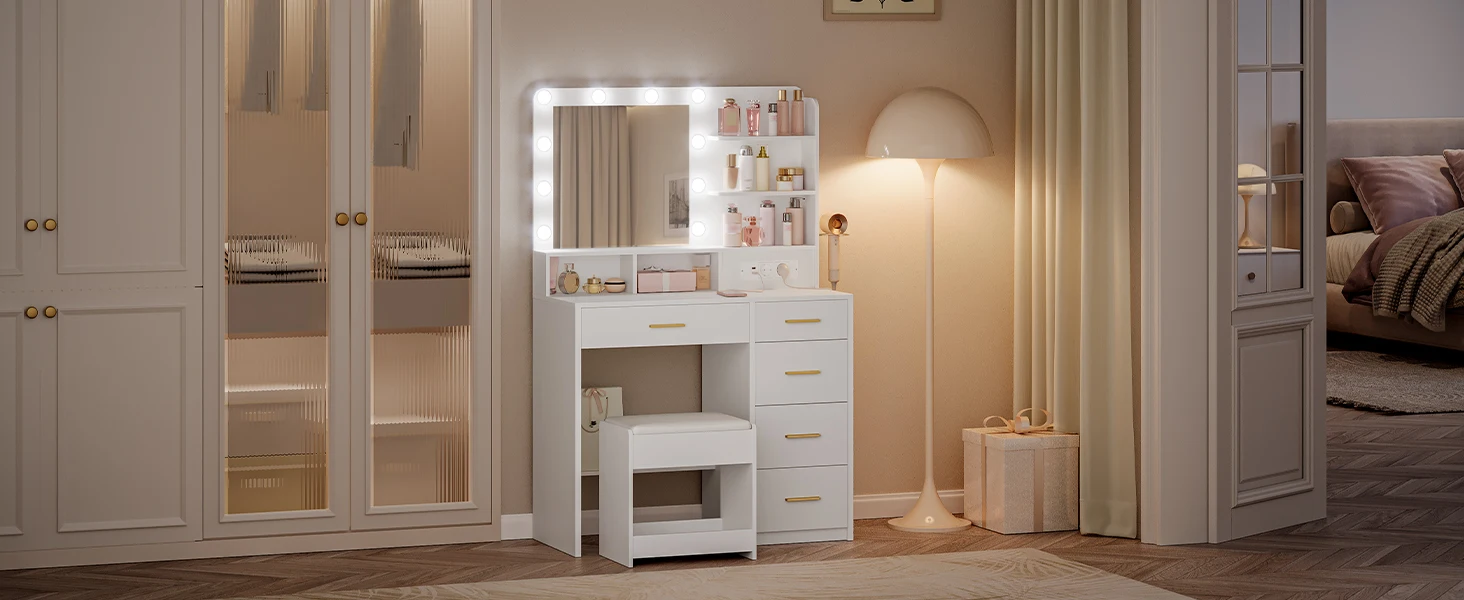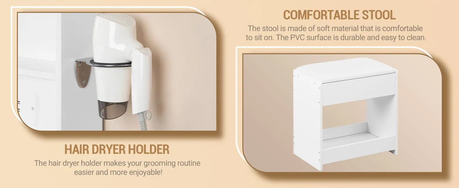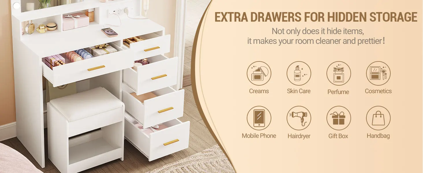【Comfortable Soft Stool】This dressing table comes with a soft makeup stool. It is comfortable so that you can enjoy ultimate comfort during your makeup process. There is also a storage each layer under the stool. You can store small items that you don't often use in it, which is convenient and space-saving.
