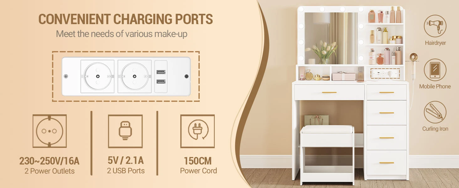 【Convenient Charging Station and Hair Dryer Stand】Equipped with 2 AC outlets and 2 USB ports, it can easily solve all kinds of charging problems while creating a beautiful appearance. A good hair dryer stand not only gives your hair dryer a safe home, but also makes it more convenient to use. Imagine charging your mobile phone while you do your makeup, plug in your hair dryer, and complete your hair styling with ease.