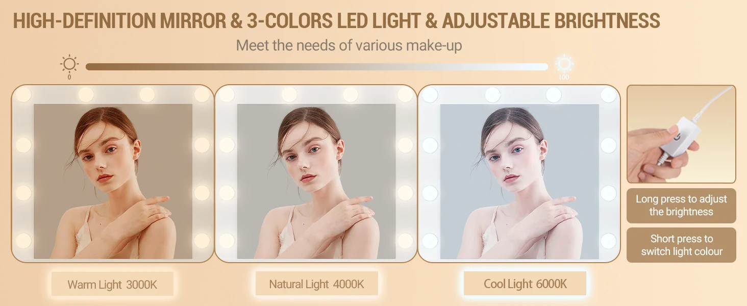【3 Lighting Modes and Adjustable Brightness】This dressing table comes with a bulb-lit mirror with 3 color modes (warm, natural and cool). You can change the color mode by pressing the touch switch or adjust the brightness by long pressing the touch switch.