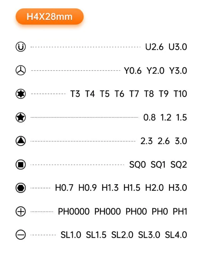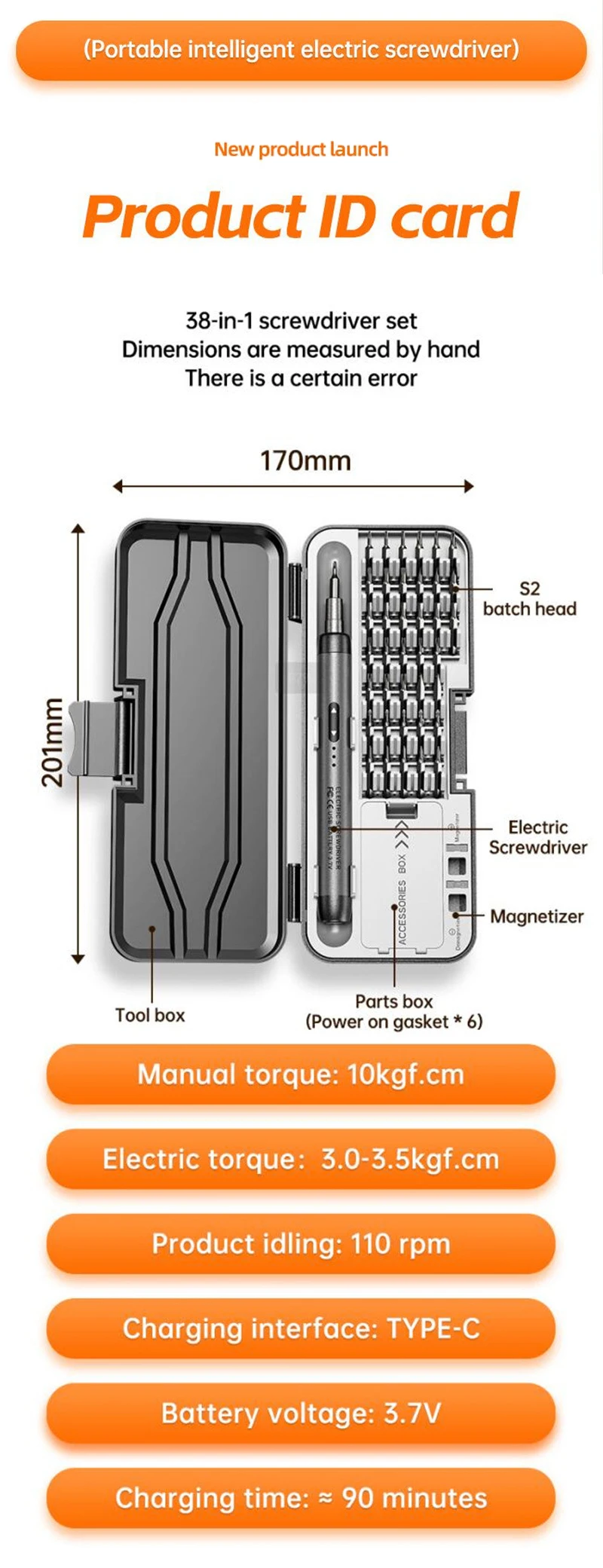 Product 1set includes: 38pcs screwdriver bits, 1pcs charging cable and 6pcs disassembly picks